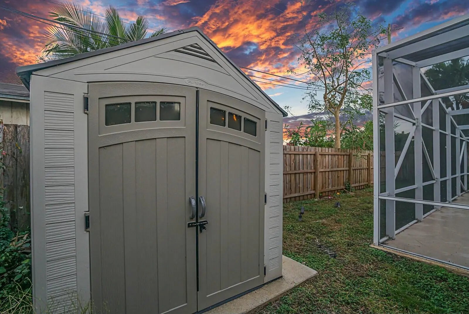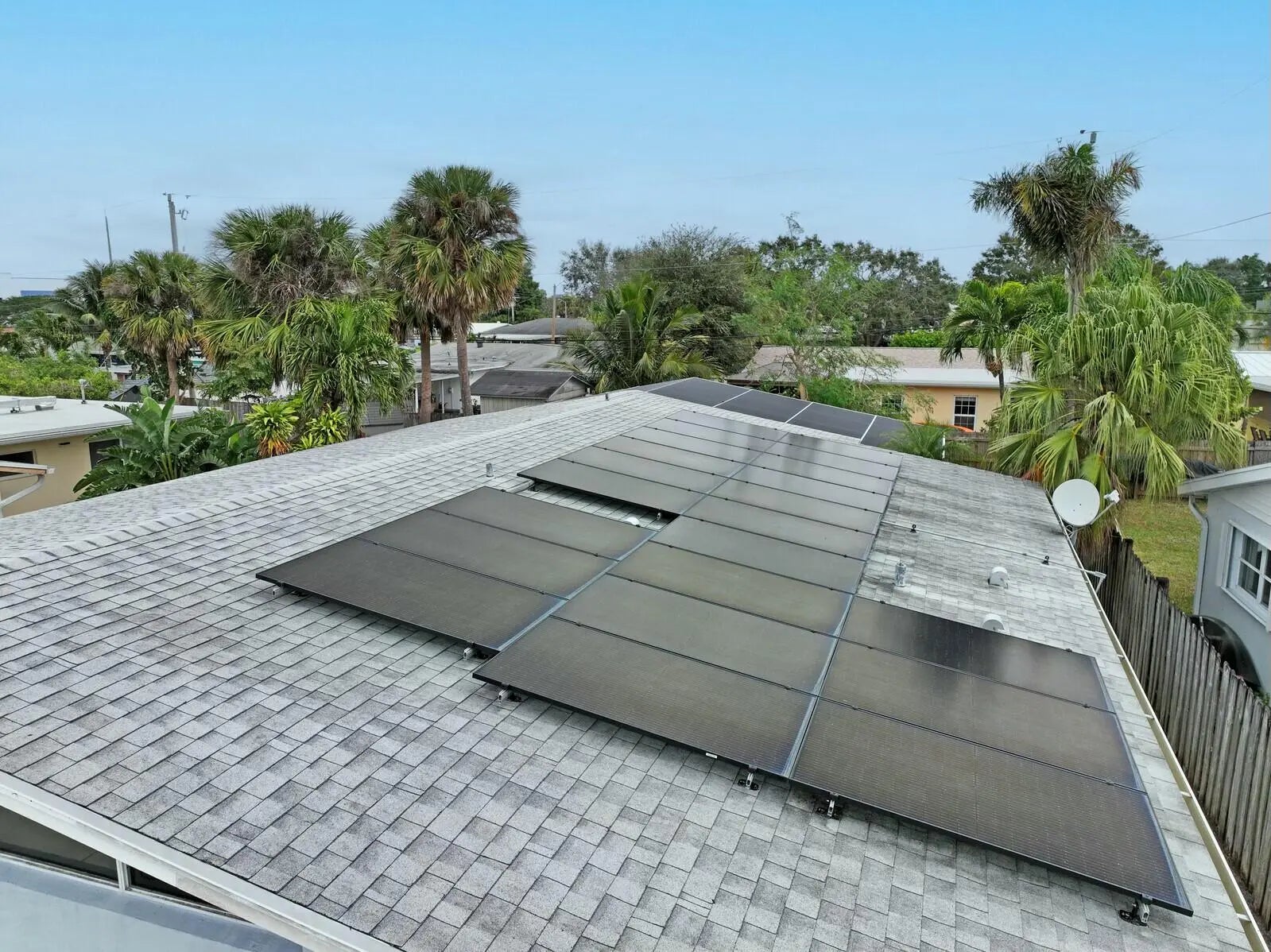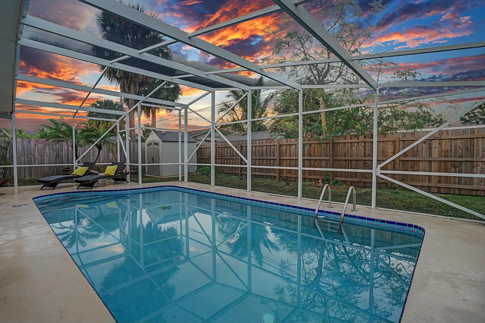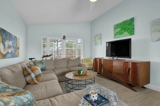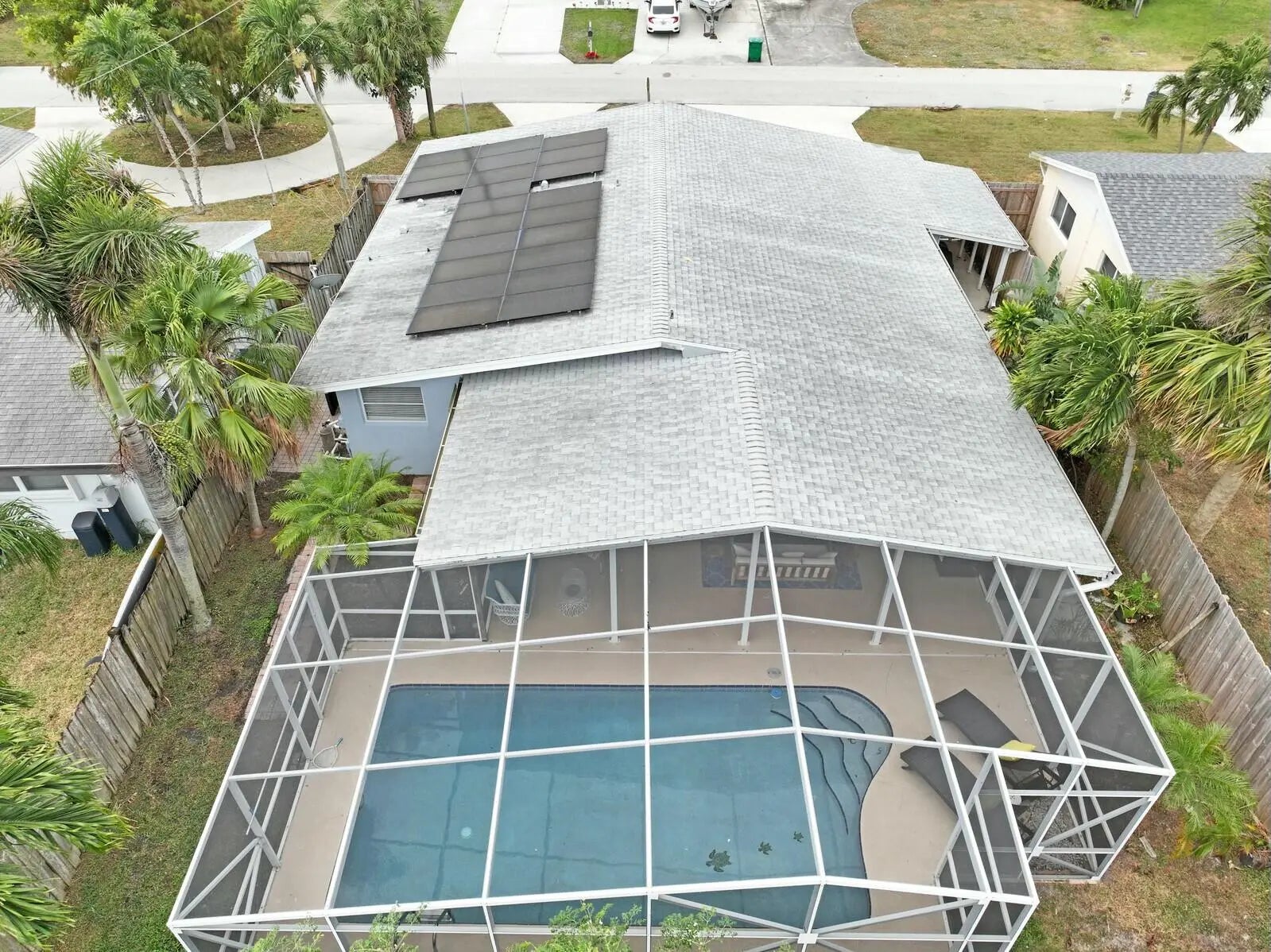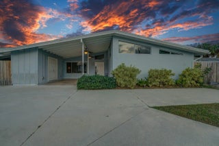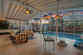 This beautifully upgraded vaulted-ceiling mid-century single-family home in Palm Beach Gardens features 3 bedrooms and 2 bathrooms, with no HOA fees. Recent renovations include a new roof (2018), solar panels (2022), HVAC (2022), upgraded plumbing, and new electrical systems (2022).The interior features coastal porcelain tile, a contemporary kitchen equipped with s/s appliances, and renovated bathrooms. It offers seamless indoor-outdoor living, highlighted by a spacious covered patio that leads to a private pool, which is enhanced by a new oversized screened enclosure, ideal for entertaining. Additional highlights include a spacious carport, extra storage, a fenced yard suitable for children and pets, new landscaping, and ambient poolside lighting. This property is truly a must-see