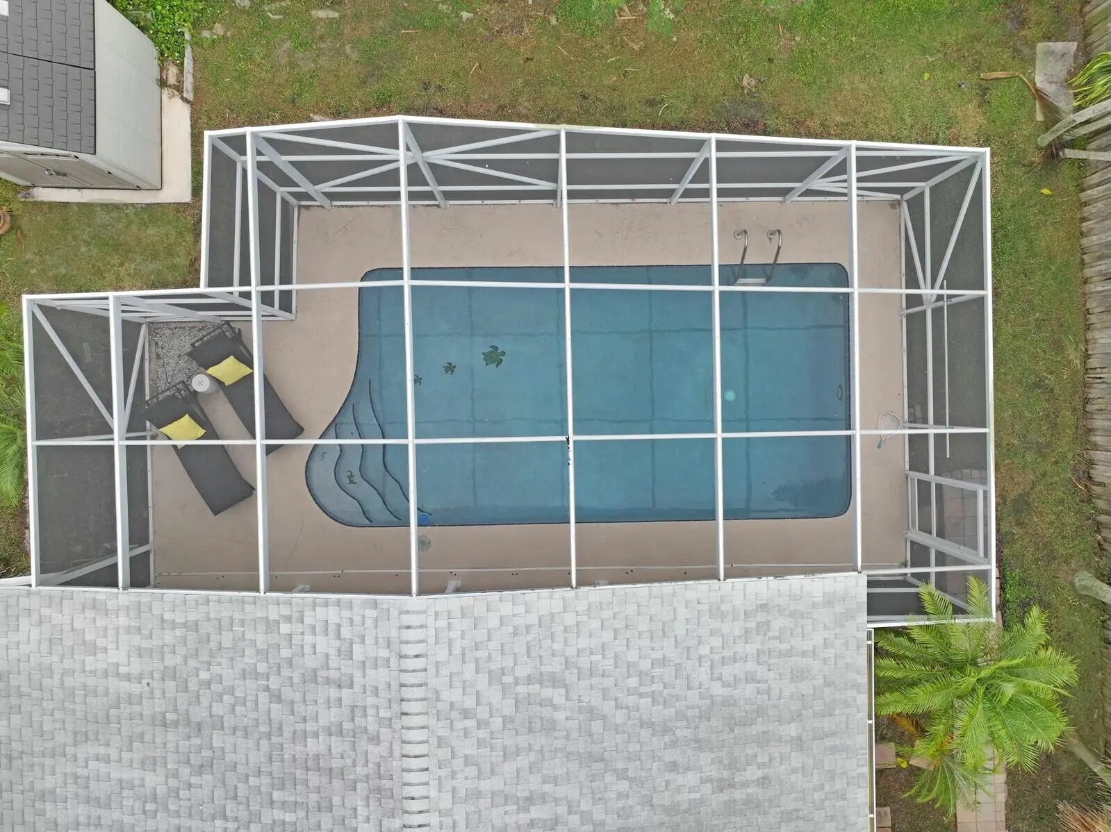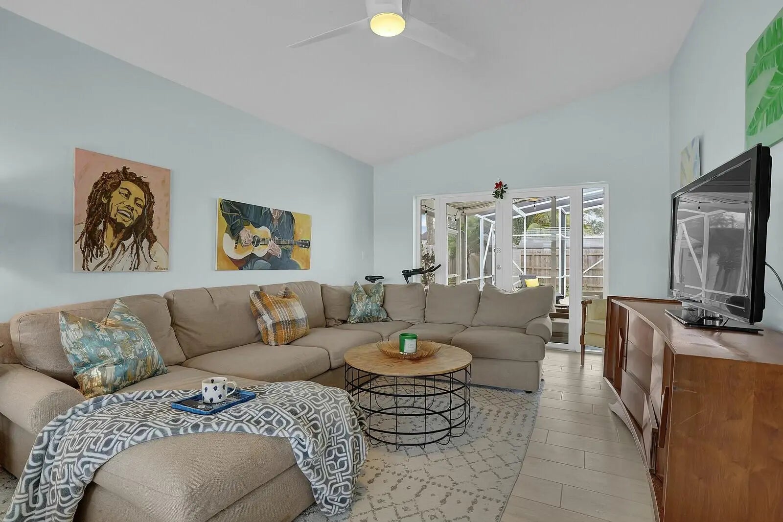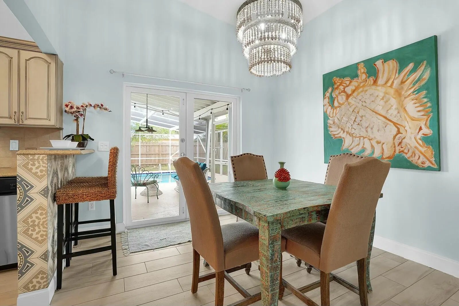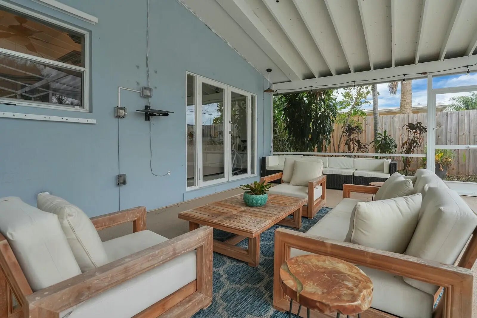 This beautifully upgraded vaulted-ceiling mid-century single-family home in Palm Beach Gardens features 3 bedrooms and 2 bathrooms, with no HOA fees. Recent renovations include a new roof (2018), solar panels (2022), HVAC (2022), upgraded plumbing, and new electrical systems (2022).The interior features coastal porcelain tile, a contemporary kitchen equipped with s/s appliances, and renovated bathrooms. It offers seamless indoor-outdoor living, highlighted by a spacious covered patio that leads to a private pool, which is enhanced by a new oversized screened enclosure, ideal for entertaining. Additional highlights include a spacious carport, extra storage, a fenced yard suitable for children and pets, new landscaping, and ambient poolside lighting. This property is truly a must-see