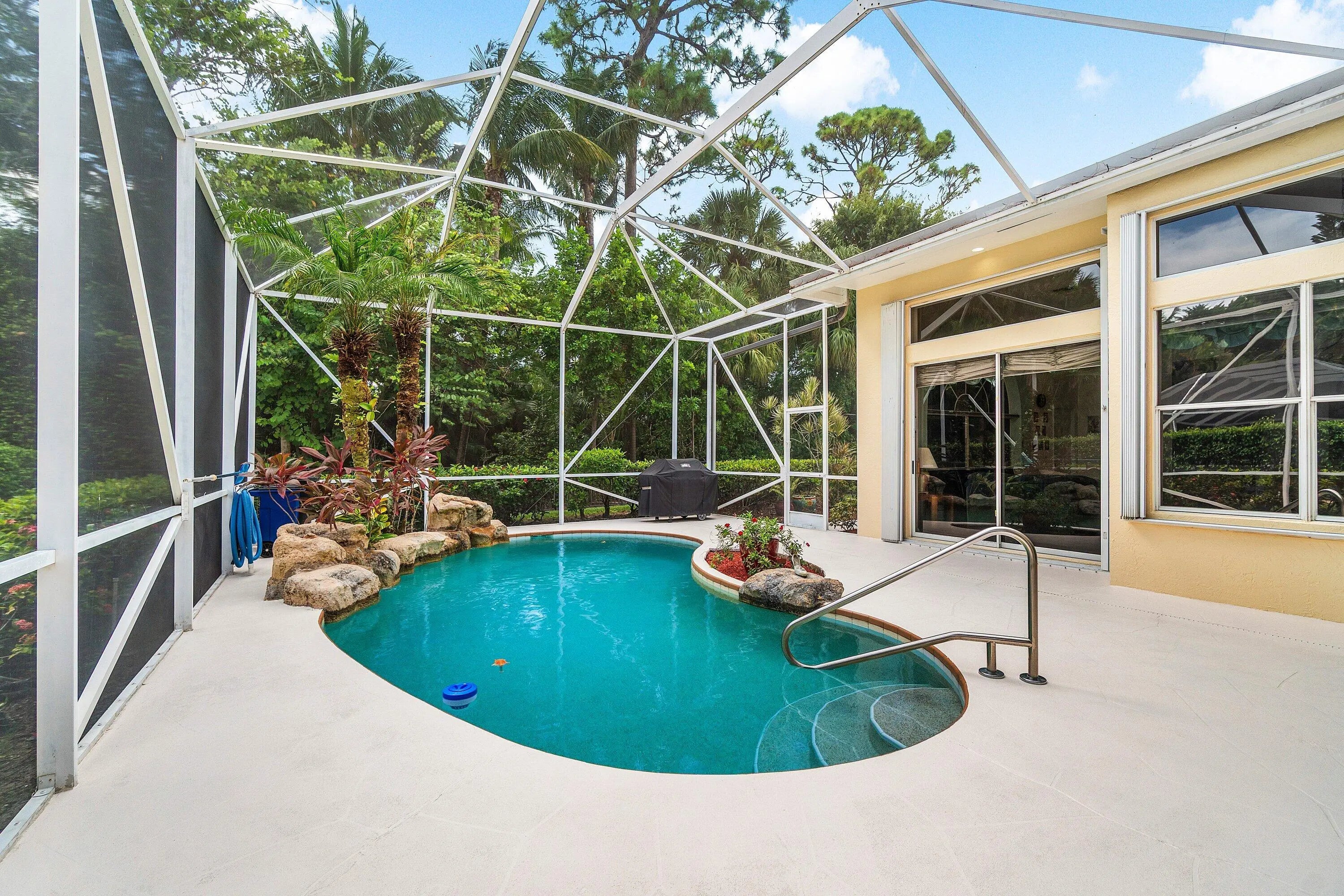 Discover the tranquil elegance of Cypress Hollow, an intimate gated community of just 56 homes nestled in the heart of Palm Beach Gardens, Florida. This beautifully maintained single-story residence features 4 generous bedrooms and 3 full bathrooms, ideally situated on a stunning lakefront lot that backs directly to a serene wooded preserve—adjacent to the prestigious Ballenisles Country Club. This prime positioning delivers unmatched privacy, peaceful surroundings, and the essence of relaxed Florida luxury. Step into your own private paradise with a screened-in pool oasis, enhanced by a captivating tropical rock waterfall, swaying palm trees, and expansive entertaining space perfect for gatherings or quiet relaxation. Recent upgrades ensure peace of mind and modern convenience