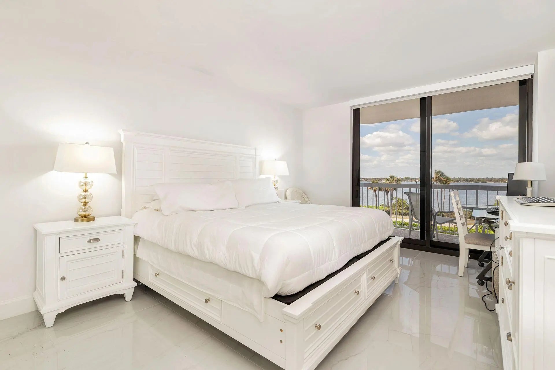 Situated directly on the Atlantic Ocean with miles and miles of sandy beach, the Meridian is one of the premier buildings in Palm Beach. View spectacular sunsets and your direct Intracoastal view throughout the living room and both bedrooms. Linger over your favorite beverage on the spacious porch which stretches across the entire unit. Beautifully renovated with magnificent open kitchen - perfect for entertaining, stunning primary bath, impact windows/doors, electric shades, washer & dryer, fully furnished and ready to be enjoyed. Tennis, pickleball, gym and resort-style pool. 24 hour staffed gate and enclosed garage parking.
