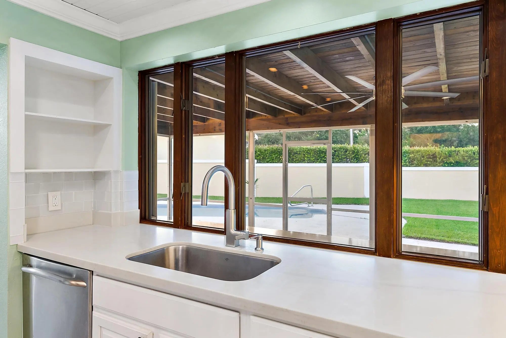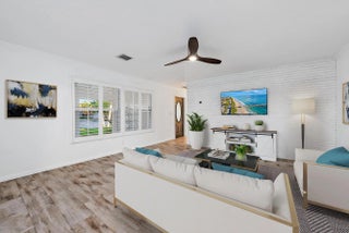 Discover the perfect blend of coastal charm and everyday comfort in this beautifully updated CBS home tucked away on a quiet Tequesta cul-de-sac. Set on a large pie-shaped lot, the property offers exceptional outdoor living — a sparkling pool, expansive green space, and generous driveway space on both sides of the home, including a 40-foot concrete pad ideal for boat or RV parking. Inside, the home exudes a fresh, coastal feel with wood-look ceramic tile flooring throughout and a bright, open layout designed for relaxed living. The kitchen features quartz countertops, ample counter space, a large pantry, and a convenient pass-through to the patio — perfect for entertaining. The spacious Florida room opens to the pool area, creating a seamless indoor-outdoor flow. The primary suite offers a walk-in closet and serene backyard views, while the additional bedrooms include built-in closets and ceiling fans in every room. The living area includes a wall-mounted TV and a cozy electric fireplace feature for added ambiance. The one-car garage is versatile and well maintained, featuring a painted concrete floor, insulated garage door, new 2024 A/C and heating wall unit, washer and dryer, and a second refrigerator all included. Major updates provide peace of mind with a new roof (2021), A/C (2020), and full hurricane protection throughout. Enjoy privacy and peace with no rear neighbors the back wall is city-owned and maintained, with an easement that enhances the usable yard space. Located just minutes from Jupiter's turquoise waters, scenic boat ramps, and the Inlet Village, this home combines convenience, quality, and the best of Florida's coastal lifestyle.