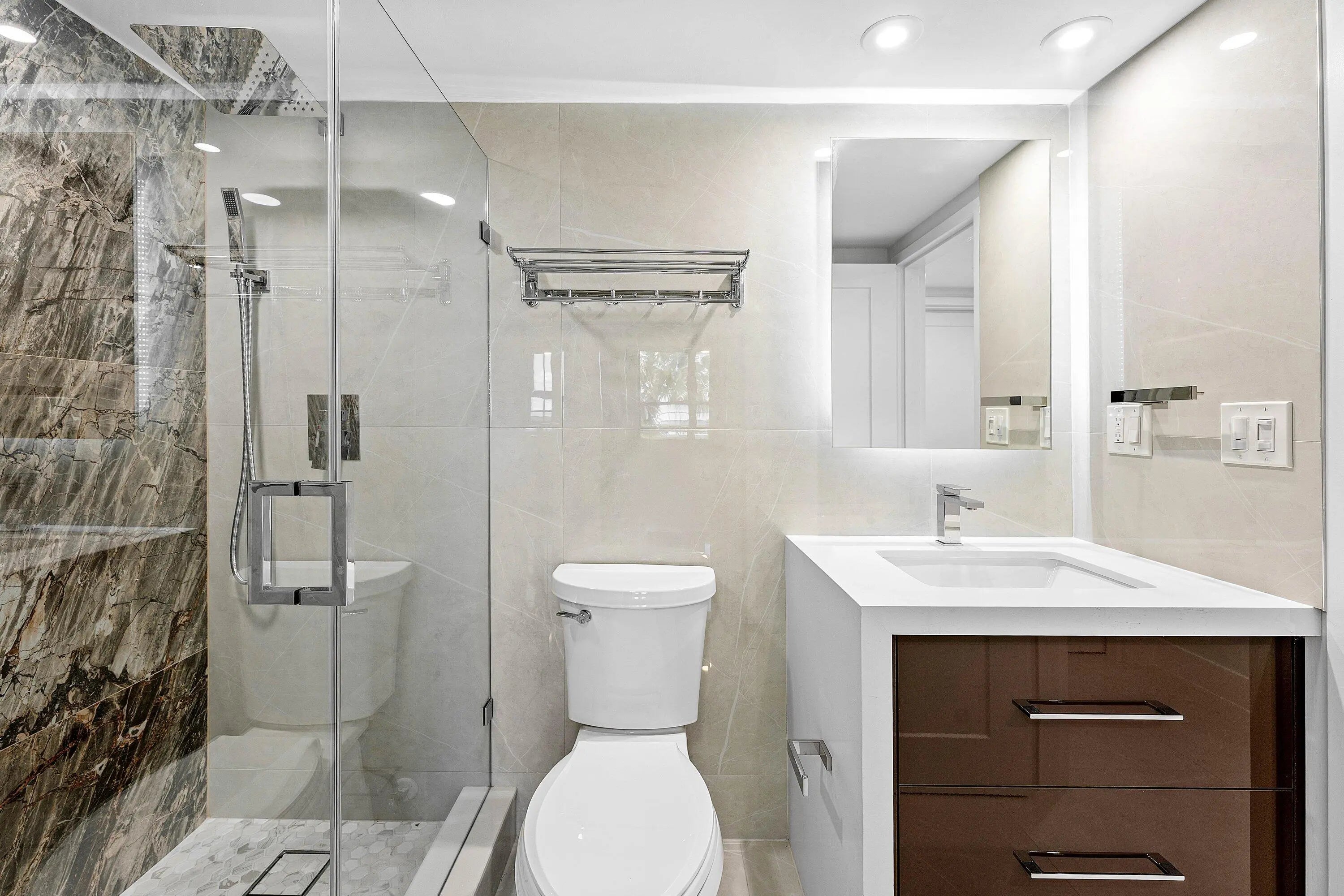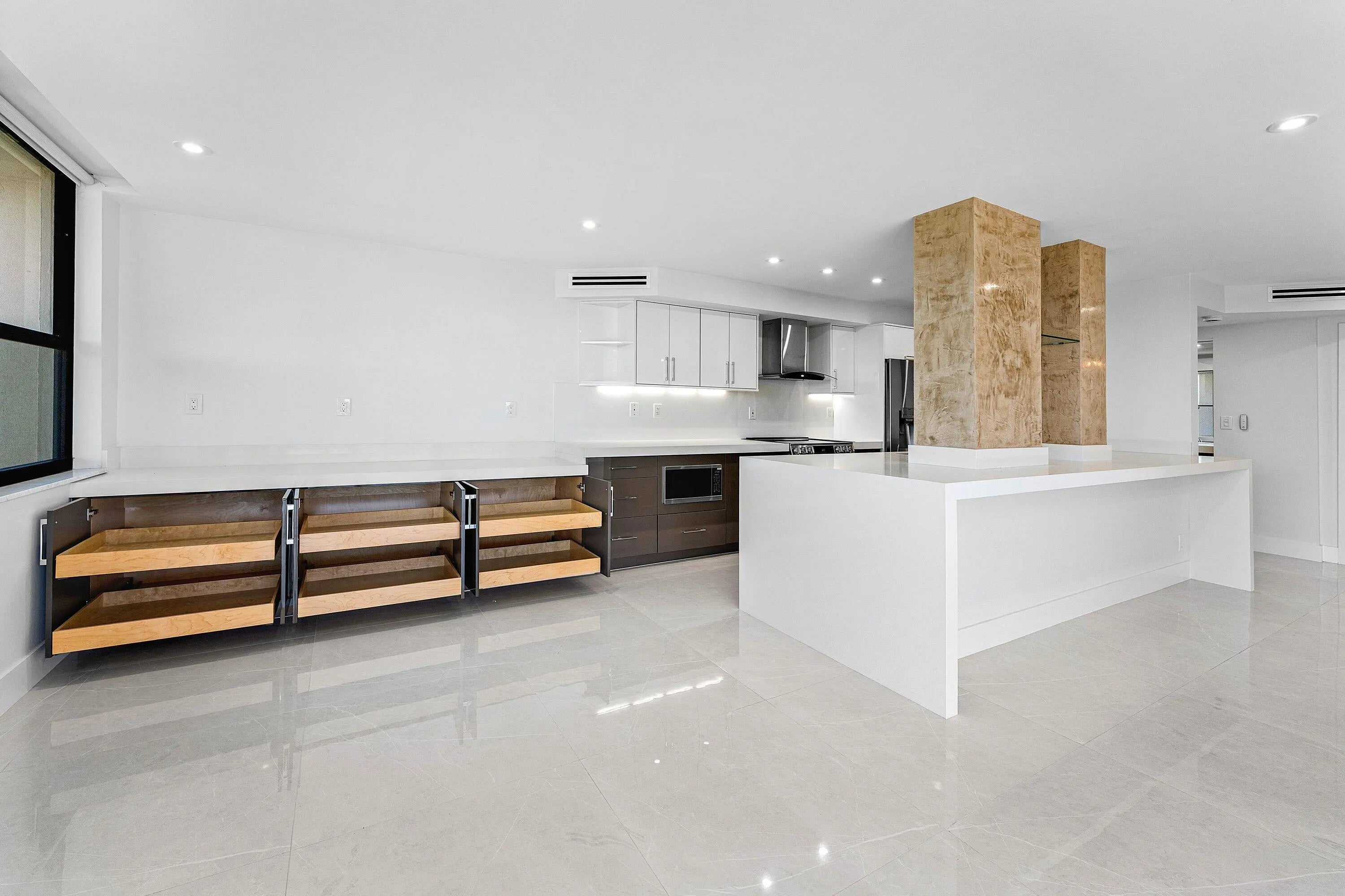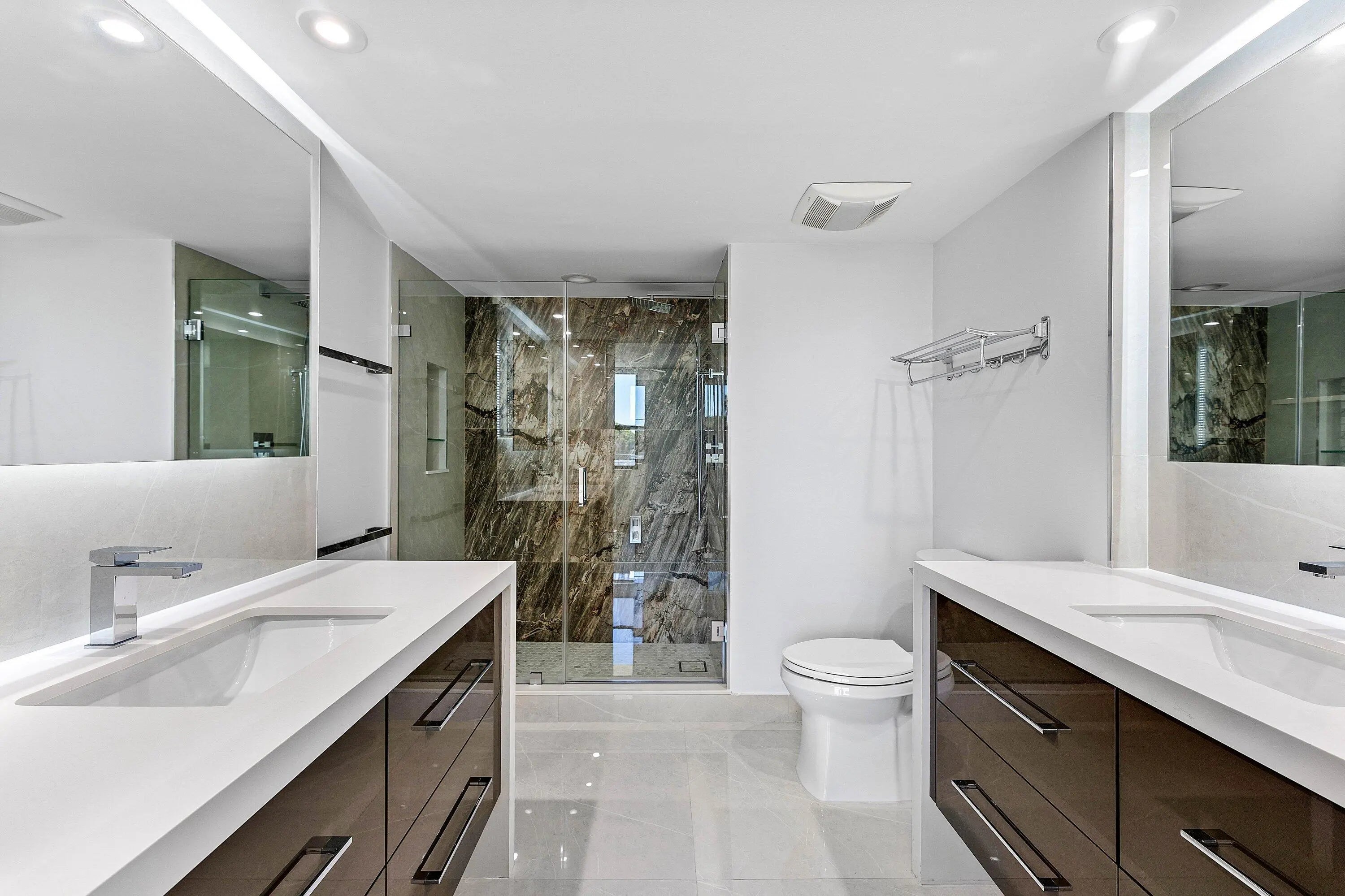 Move right in! COMPLETELY RENOVATED with high end, luxurious finishes. This 2 bed/2 bath split floorplan condo offers 32'' tile floors throughout; quartz countertops, backsplash, and waterfall edges; LG stainless appliances; washer/dryer, soft-close drawers, pull-out shelves in cabinets, rain and handheld shower heads; square tiled shower drains; linear vent covers; custom built-in closets; sensor lights in bathroom and cabinets; LED lights throughout; automatic blinds; impact windows; new A/C, and new water heater. Wrap-around sunrise/sunset balcony. Building concrete restoration complete & new seawall to be completed soon. Assessments Seller paid. Heated pool, fitness room, and gas grills. Close to PBI airport & world-class shopping, dining, golf, and water activities
