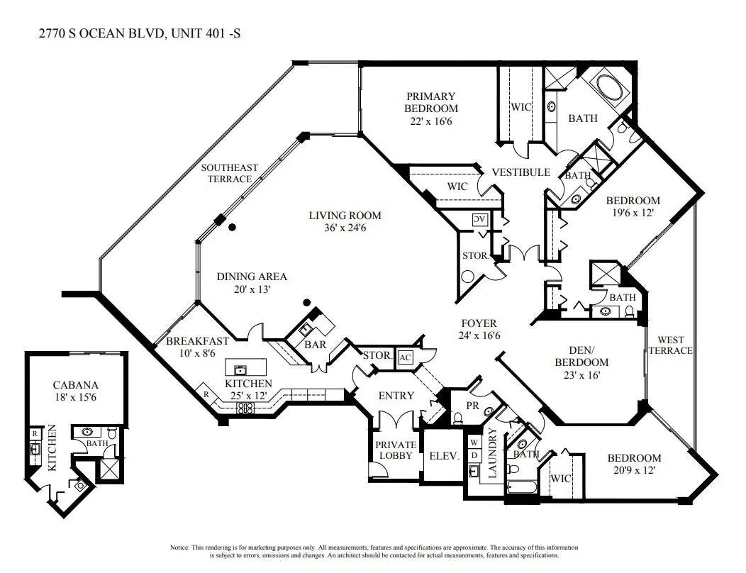 A rare condo offering in Palm Beach. Meticulously-maintained 4 Bedroom, 4.5 Bathroom apartment with breathtaking ocean and Intracoastal views from almost every room. This thoughtfully-designed unit lives like a home with over 4300 sf under air and light-filled, expansive living spaces. Greeted by a private elevator and foyer, the elegant floor plan offers comfort in every room with voluminous ceiling heights and gracious proportions. Balconies flank nearly every major room and provide views spanning all exposures. Additionally, the apartment includes a unique poolside cabana guest suite with full bathroom and kitchenette. The exclusive 2770 boutique building provides the finest white glove service with only 30 units and resort-like amenities including a renovated gym. DISCLAIMER: The written and verbal information provided including but not limited to prices, measurements, square footages, lot sizes, calculations and statistics have been obtained and conveyed from third parties such as the applicable Multiple Listing Service, public records as well as other sources. All information including that produced by the Sellers or Listing Company are subject to errors, omissions or changes without notice and should be independently verified by any prospect for the purchase of a Property. The Sellers and Listing Company expressly disclaim any warranty or representation regarding all information. Prospective purchasers' use of this or any written and verbal information is acknowledgement of this disclaimer and that Prospects shall perform their own due diligence. Prospective purchasers shall not rely on any written or verbal information provided when entering a contract for sale and purchase. Some affiliations may not be applicable to certain geographic areas. Copyright 2023 Listing Company. All Rights Reserved.