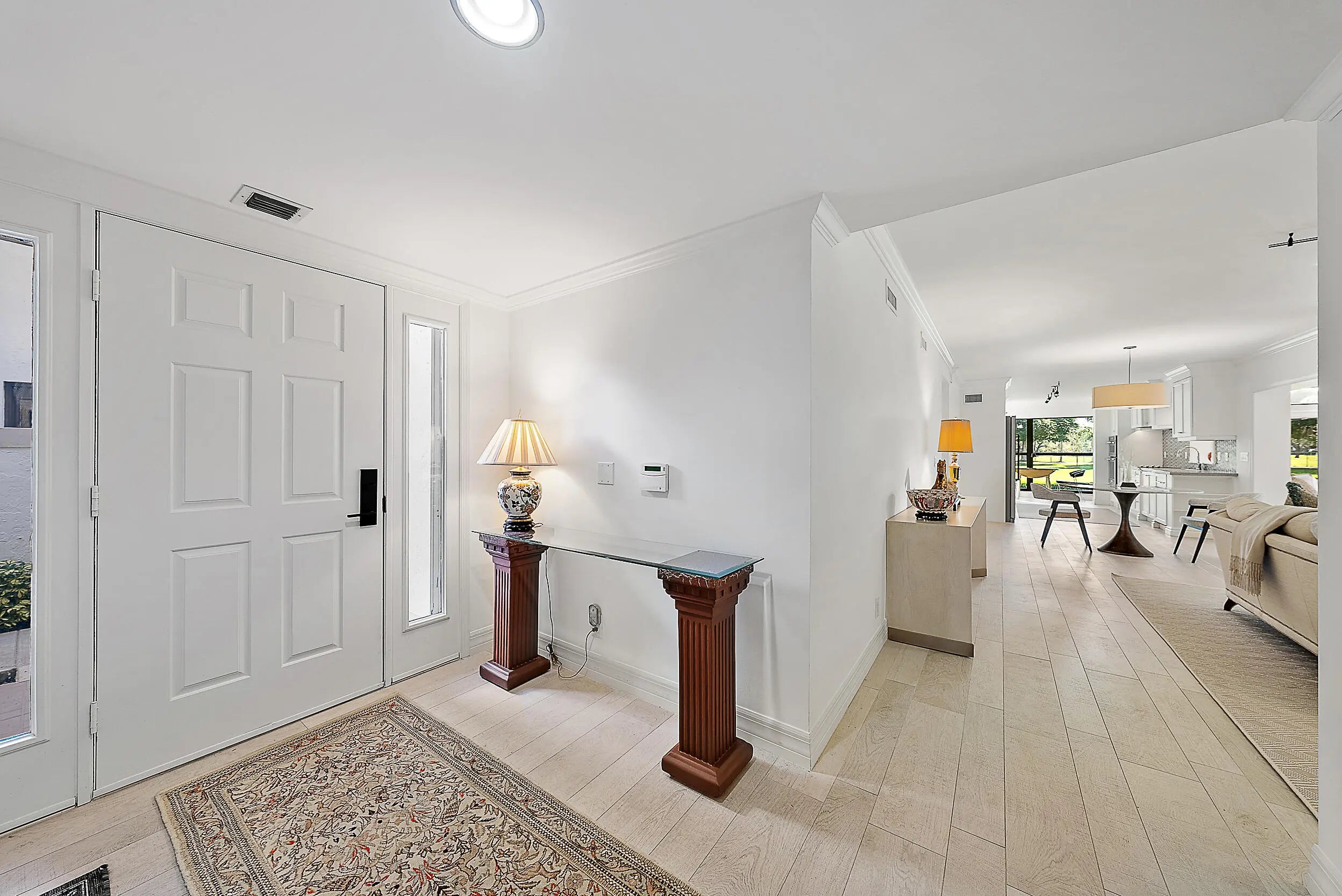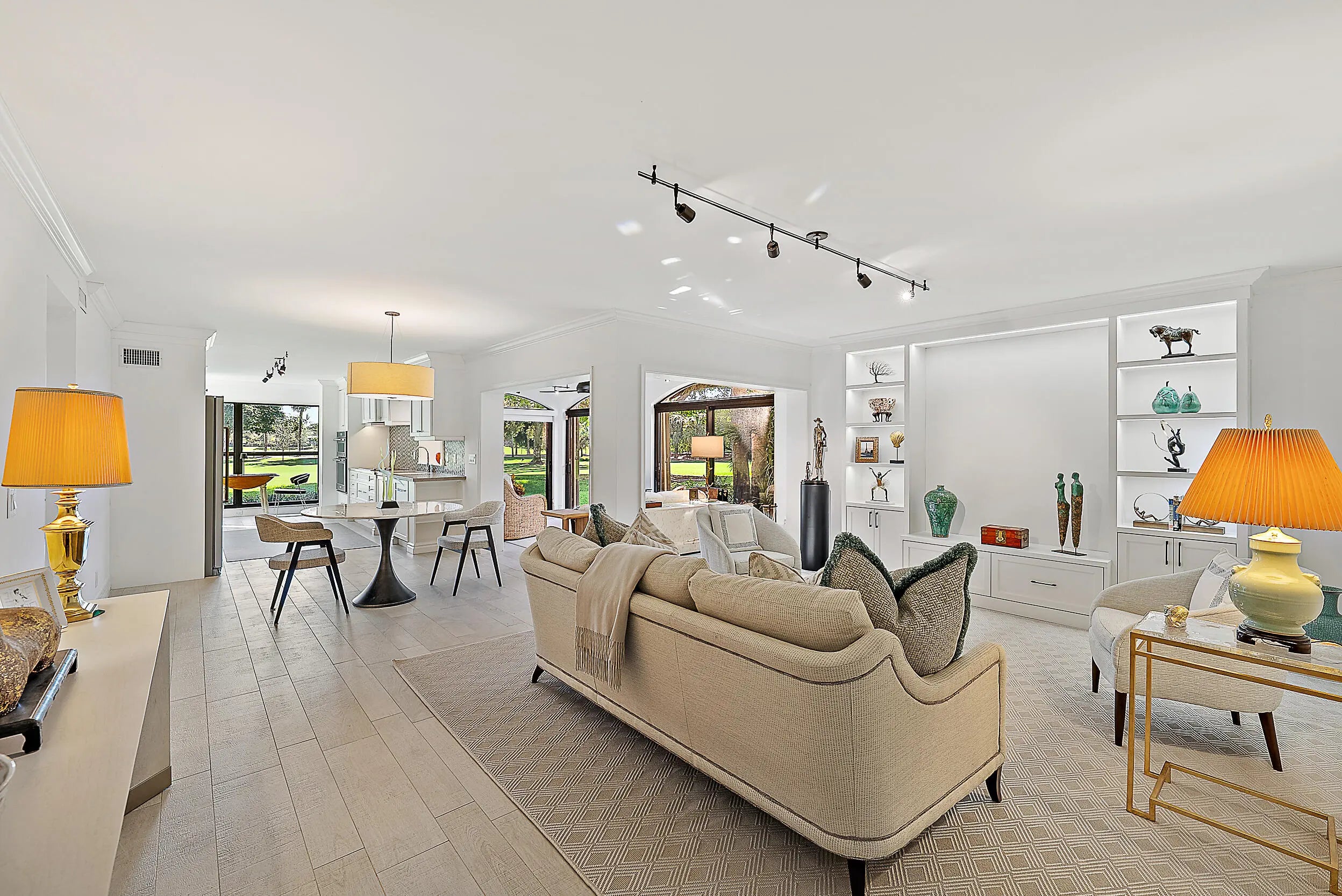 BEST PRICED UNIT IN TRADERS CROSSING! $116K Under the last comparable sold in Traders Crossing. Experience effortless luxury and serene golf course views on the 9th hole of the Village course in this beautifully updated, single-story 2-bedroom, 2-bath condo in the coveted Traders Crossing community of Jonathan's Landing. This light-filled first-floor home offers elegant living space with porcelain tile floors, crown molding, and a brand-new custom built-in cabinet in the living area. The recently updated kitchen features new hurricane-impact windows, white shaker cabinetry, quartz countertops, a chevron backsplash, and stainless steel appliances including double wall ovens. Enjoy sweeping golf course views from the kitchen, living room, enclosed sunroom, and primary suite.