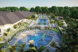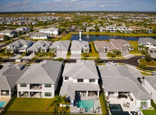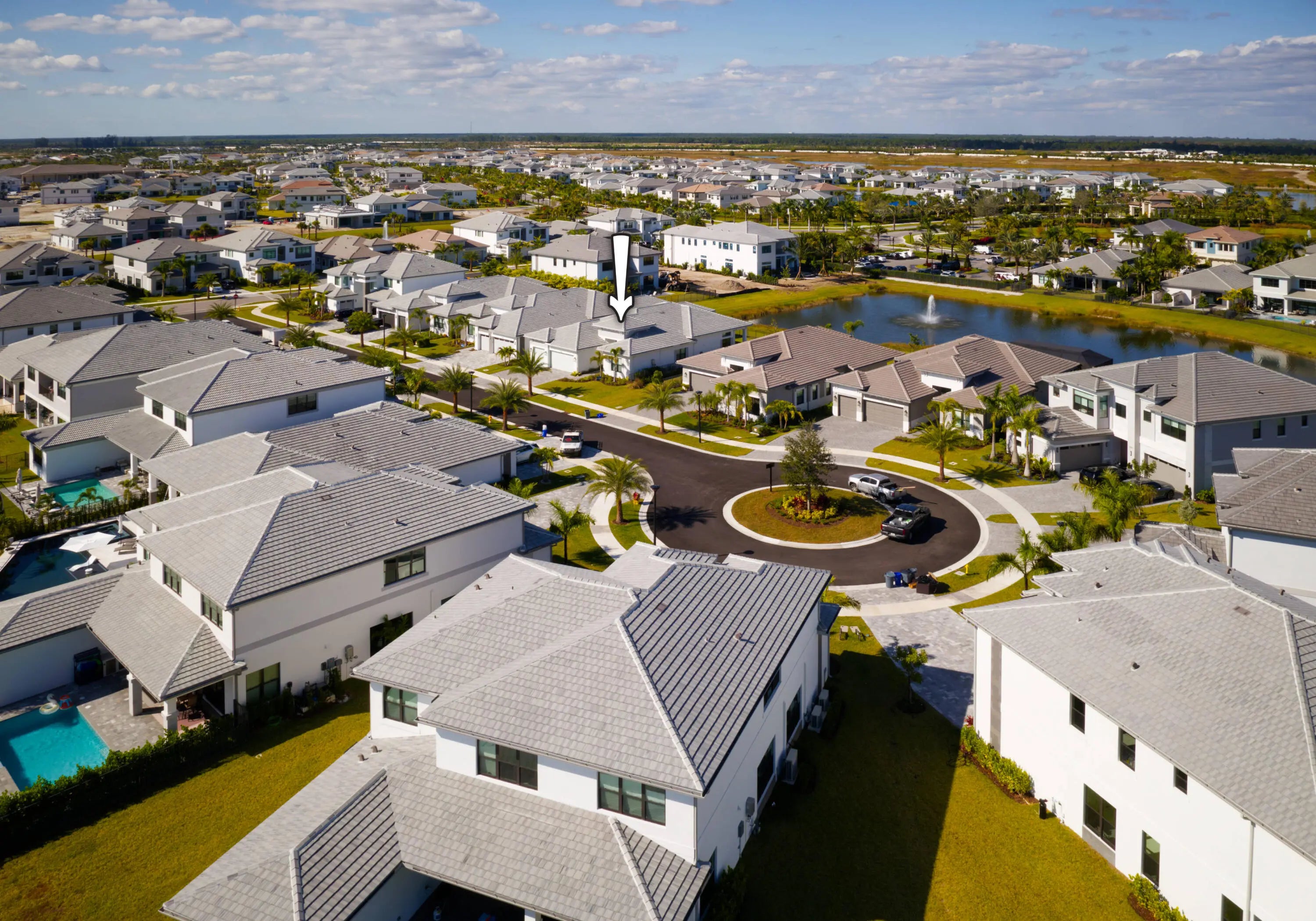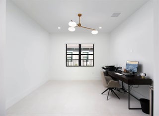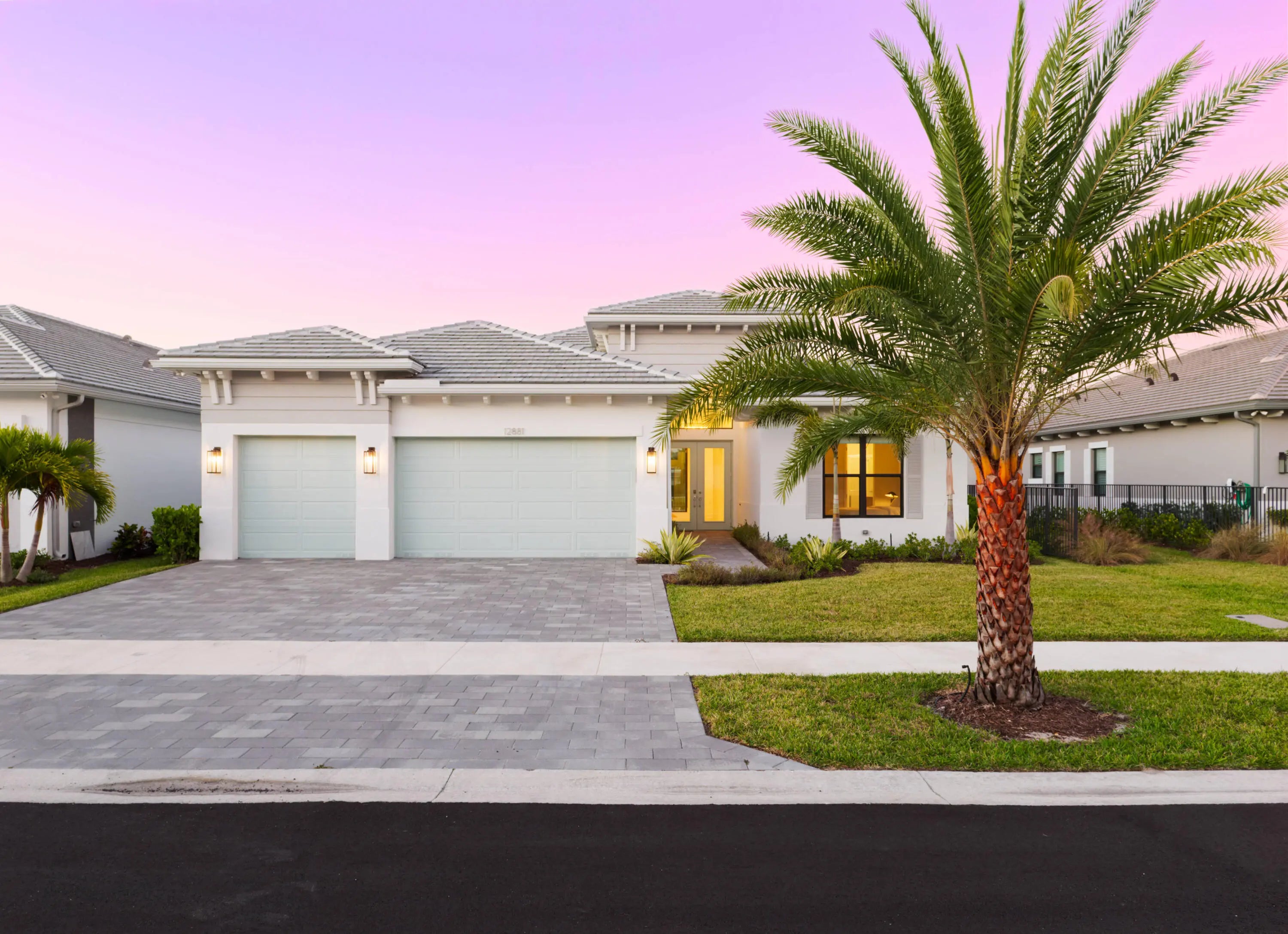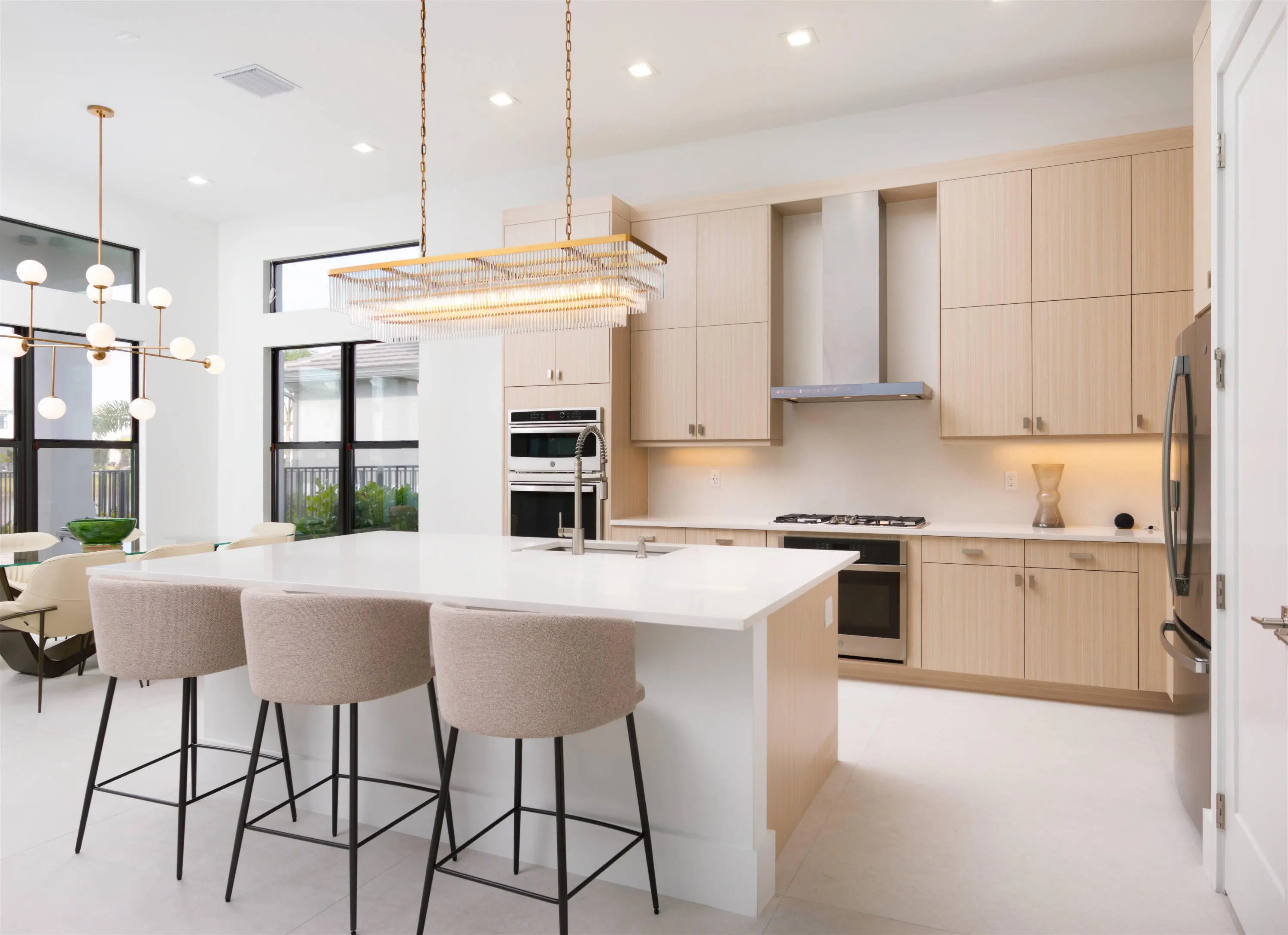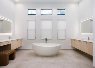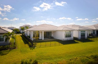Experience refined contemporary living in this newly built 2024 single-story residence located in the prestigious Apex at Avenir. With 3,248 square feet of thoughtfully designed living space on an 8,085-square-foot lakefront lot, this 4-bedroom, 4.5-bath home with an office and a 3-car garage delivers a perfect blend of luxury, comfort, and modern elegance. Through elegant French doors, the foyer welcomes you with soaring ceilings and a breathtaking chandelier that instantly sets a tone of sophistication. Large-format stone-look porcelain tile, an alabaster-toned color palette, and custom high-end lighting thoughtfully placed throughout create a bright, cohesive environment that balances elegance with clean, contemporary warmth. The expansive great room is ideal for both relaxation and entertainment, featuring a recessed ceiling, a media-ready wall, and double sliding doors that open to the covered patio. The adjacent gourmet kitchen showcases modern white oak cabinetry, crisp white quartz countertops and backsplashes, an impressive island with extra storage and seating, and a full suite of stainless steel appliances including a gas range. The elegant dining room, framed by large windows, offers peaceful views of the side garden and the shimmering lake and fountain. A dedicated office provides a spacious and quiet retreat for work or study. The primary suite is a true sanctuary, appointed with warm wood flooring, a recessed ceiling, and serene lake views. It includes room for a sitting area, dual walk-in closets, and a luxurious spa-inspired bathroom featuring dual vanities (one with a make-up/dressing station), a grand soaking tub, and an expansive glass-enclosed rain shower with floor-to-ceiling tile and a built-in bench. Three additional guest suites offer warm wood flooring, walk-in closets, and private en-suite bathrooms, each serving as a blank canvas for individual style. Outdoor living is effortless with a covered patio designed for entertaining, with distinct seating and dining areas and views of the manicured, fully fenced backyard. With plenty of room for a future pool and spa, the property backs to a tranquil lake and fountain for stunning daily scenery. Additional features include full impact windows, a spacious interior laundry room with abundant storage, a utility sink, and high-efficiency appliances. This is modern Florida luxury at its finest, stylish, expansive, and designed for elevated living.