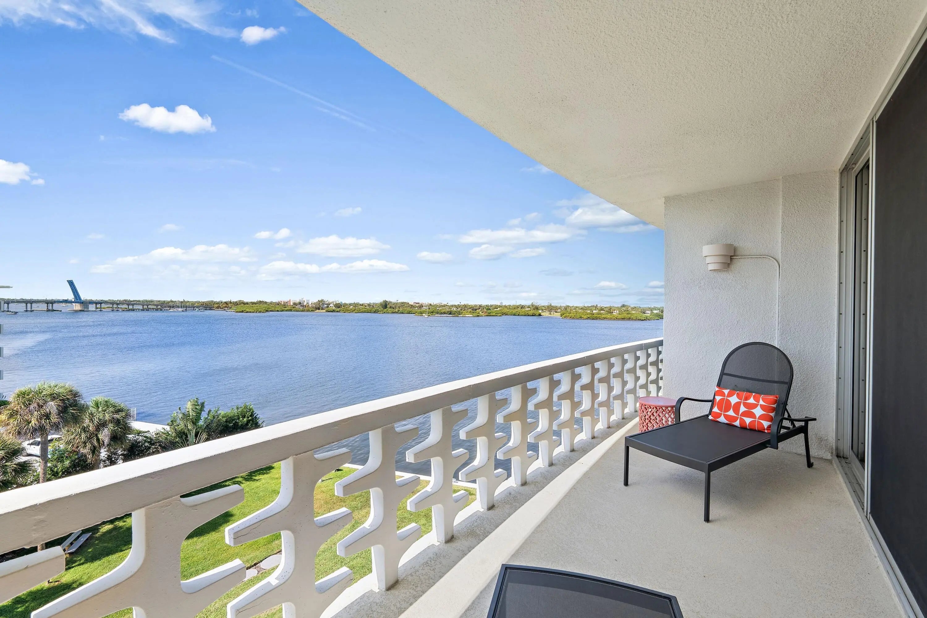 Enjoy breathtaking views and sunsets overlooking the Intracoastal in this meticulously renovated 2-bedroom, 2-bath penthouse, designed for elegance and comfort. The split-plan home is a masterpiece of modern luxury, featuring a custom Italian-design kitchen with high-end appliances, including Fulgor Milano induction range, Miele dishwasher, and Bosch refrigerator, set against stunning Cristallo Royal quartzite countertops and backsplash. Other high-end finishes include, wood flooring throughout bringing warmth and sophistication, custom LED lighting, motorized shades in every room, fine brass hardware in kitchen and baths, and custom closets. The primary bath offers a peaceful retreat with an elegant marble topped vanity and beautiful frameless glass shower. Enjoy peace of mind with all-impact glass, new wiring, and new plumbing, and the newest in design in heat sensor technology ensuring modern convenience and safety. Located in an iconic Mid-Century Modern masterpiece designed by renowned Palm Beach architect Gene Lawrence, this boutique building offers a Slim Aarons-like pool, along with deeded beach access for effortless seaside living. The residence also has a gym and on-site management.
