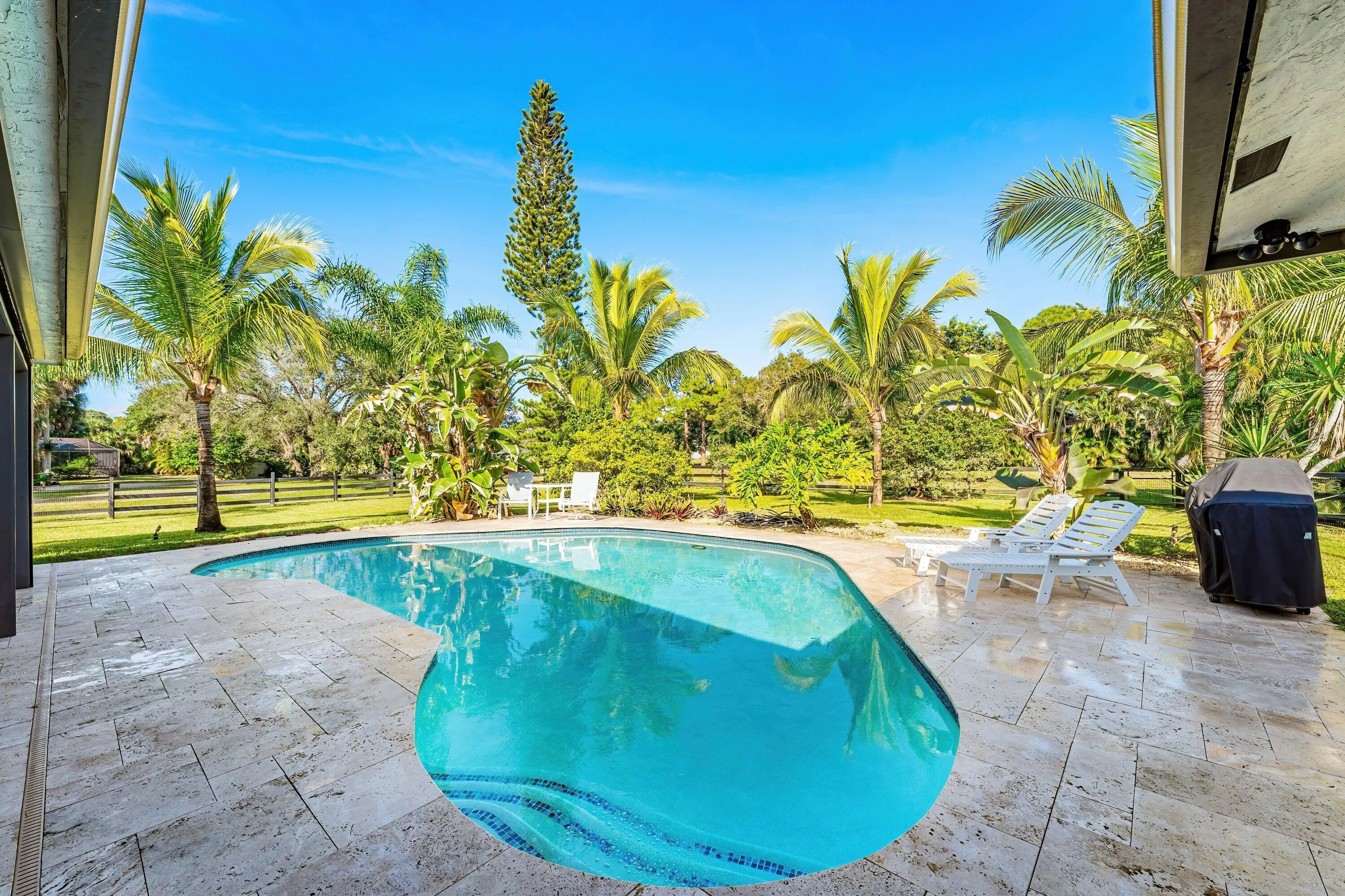 A truly rare front-section gem in one of Palm Beach Gardens' most coveted communities — where peace, privacy, and prestige all meet. This single-story masterpiece sits on nearly an acre and a half of fully fenced, beautifully landscaped grounds with lush tropical gardens, fruit trees, and hard-wired landscape lighting that transforms the property at night. Highlights: 4 Bedrooms | 2 Baths | Office/Flex Room New 2022 Metal Roof + Full Impact Windows & Doors City Water, Paved Roads, Prime Front-Section Location, Spray-Foam Insulation for maximum energy efficiency, 2021 Saltwater Pool with new paver deck & custom landscape lighting, 2024 1,200 SQ FT Detached Hangar Garage w/ 14' bay door ideal for RVs, Boats or Car collections along with paved driveway, Custom Kitchen w/ quartz counters and SS appliances, Luxurious Master Bath w/ floating vanity and designer lighting, Travertine tile pool deck and patio along with electric roll down screens. Enjoy the best of Florida living - A modernized, hurricane-ready, move-in ready retreat just mins to Alton, Abacoa and pristine Jupiter Beaches.