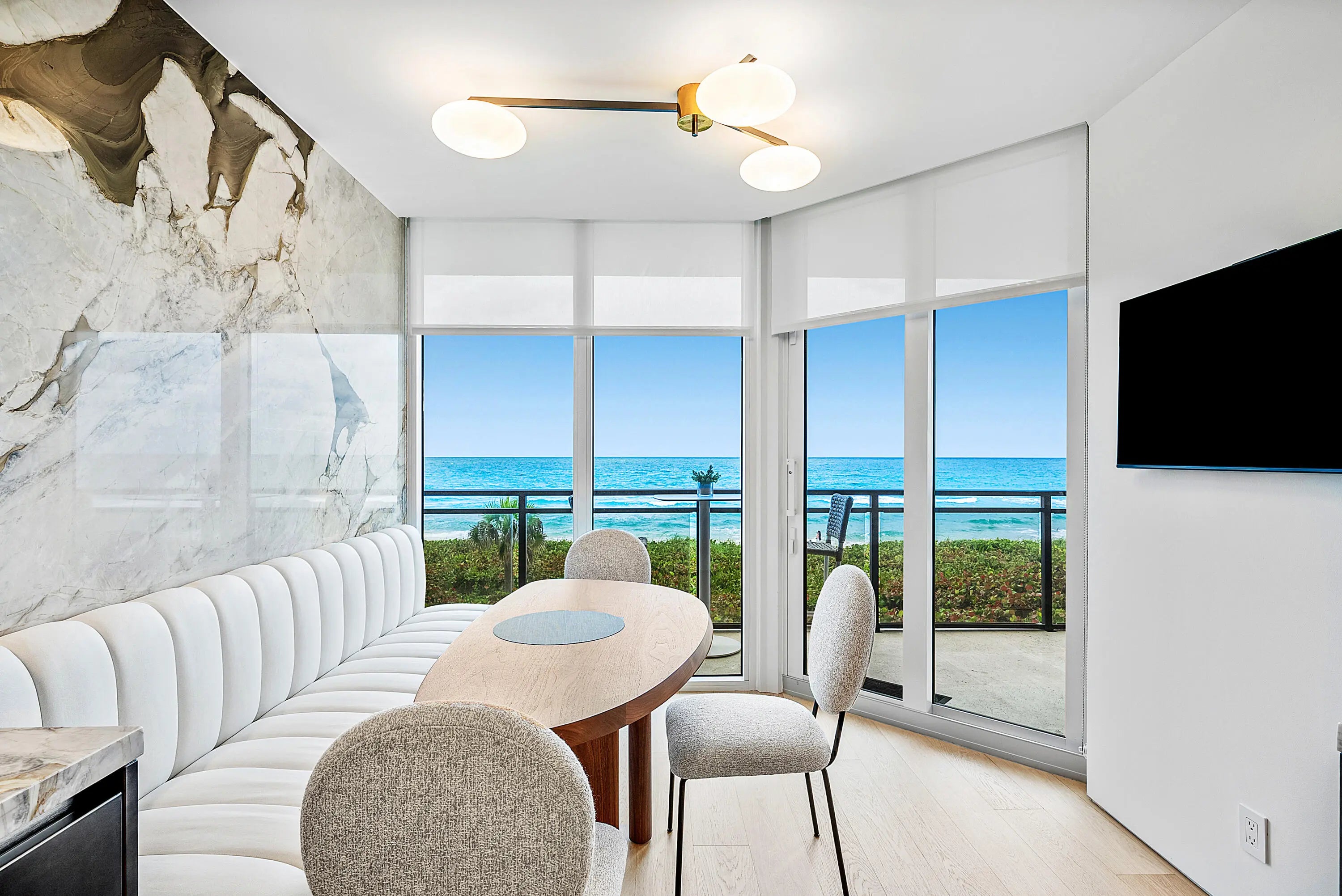 Step inside this 2,960 square foot masterpiece where bespoke interior design brings the tranquility of the ocean to life. Soaring 8' 10'' ceilings and luminous white oak floors flowing seamlessly throughout, this home is a celebration of light and space and unobstructed ocean views. Entertain flawlessly in the gorgeous dining room, perfectly sized for 10 guests, or relax in the family room, enriched with handsome wood paneling and subtle Venetian plaster walls & ceilings. Three spacious bedroom suites offer true retreat, each featuring custom closets, electric shades, and their own luxurious, marble-clad bathroom. A chic powder room completes the 3.5 bath layout. The custom Boffi kitchen is an epicurean dream, featuring natural stone countertops, a striking accent wall, and integrated Subzero & Wolf appliances. Enjoy intimate oceanside meals at the built-in dining banquet.This is more than a home; it's an elevated lifestyle where luxury is delivered to your doorstep. Every single room grants access to your private balcony and showcases stunning, unobstructed ocean views. As a rare offering, this residence includes a newly renovated poolside cabana, providing a secluded oasis just steps from the sand. The Palm Beach Hampton offers resort-style amenities that make everyday living effortless: " Gated, pet-friendly community with impeccable management and services. " Incredible fitness center. " Two tennis courts and pickleball. " Billiards and community club room. " 2 Underground Garage Spaces & Storage