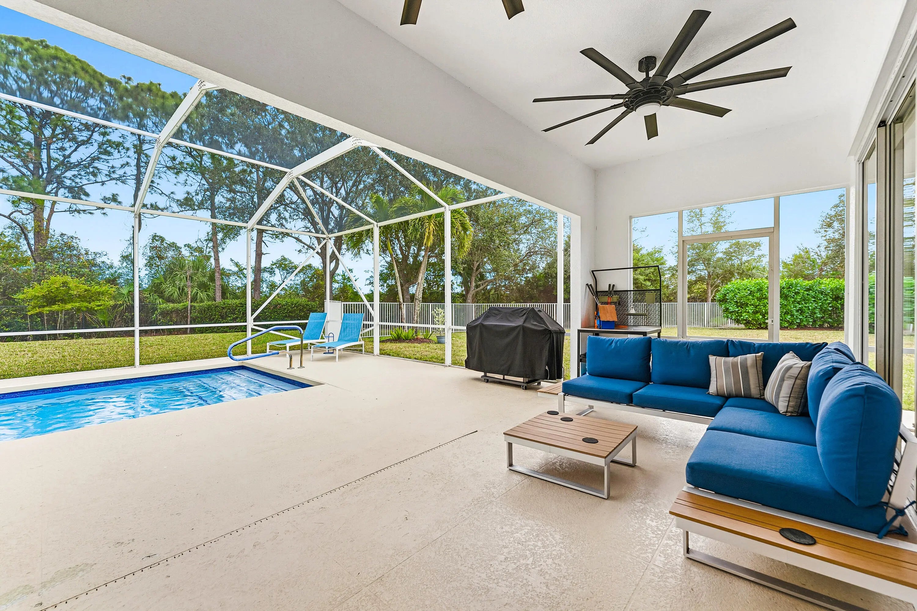 Spectacular One-Level 3 bed/Den home Like No Other in Carleton Oaks Situated on a 1/3-acre pie-shaped lot, overlooking a beautiful natural preserve and located at the end of a cul-de-sac, offering ultimate privacy. Enjoy large side and backyards, expansive screened-in pool and patio area The open floor plan features high ceilings, an abundance of windows, and glass sliding doors, creating a bright and airy atmosphere. The upgraded kitchen has been completely opened up and updated and features a newly built custom breakfast bar, quartz countertops, a herringbone tile backsplash, newer stainless steel appliances, pendant lighting, and more. European white oak porcelain tile flooring is throughout the home. The family room features custom TV wall with a built-in electric fireplace,