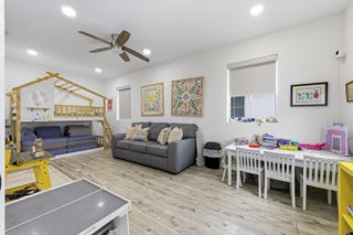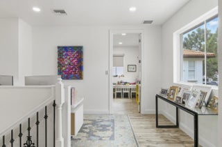 Welcome to this stunning two-story Mediterranean residence that perfectly blends warmth, elegance, and joy. Located on one of Evergrene's most desirable streets, this home is within walking distance to the resort-style clubhouse and sits on a unique lot that borders a private reserve. From the moment you enter, you're greeted by light-filled spaces designed to make you feel happy and right at home. The interior is decorated with fun, vibrant touches that bring life to every room while maintaining a sense of sophistication. All new laminate flooring flows throughout the homes first and second floor, accented by recessed lighting, crown molding, and impact windows with custom motorized shades. Additional wellness enhancements include whole house water filtration, reverse osmosis drinking system, and Reme Halo air purifiers. The formal sitting area is a cozy conversation space that leads to a stylish custom "Martini Room" with built-ins, bar, seating, wine storage and cooler, perfect for entertaining, highlighted with a chandelier and rope lighting to create ambiance. The dining room opens to the backyard through double doors. The updated kitchen offers painted cabinetry, new quartz countertops, stainless steel GE appliances including double wall ovens, and a sleek stainless sink with disposal. A walk-in pantry under the staircase adds charm and storage. The first floor also features a guest bedroom and full bath with quartz vanity, custom Missoni wallpaper, and frameless shower. Upstairs, a versatile loft connects to four bedrooms. The spacious primary suite includes a private foyer, dual custom closets, and an updated bath with soaking tub, shower, painted cabinetry, and quartz counters. Additional bedrooms feature recessed lighting and built-in closets, one even offers its own private balcony. The laundry room, equipped with Electrolux washer/dryer and storage, adds convenience. Step through impact sliders to a cheerful backyard oasis featuring a covered lanai with fan and mounted lighting, all surrounded by lush Clusia hedges and turf for easy maintenance. Thoughtfully painted inside and out, this home radiates personality, comfort, and happiness every detail curated to make you smile.