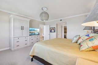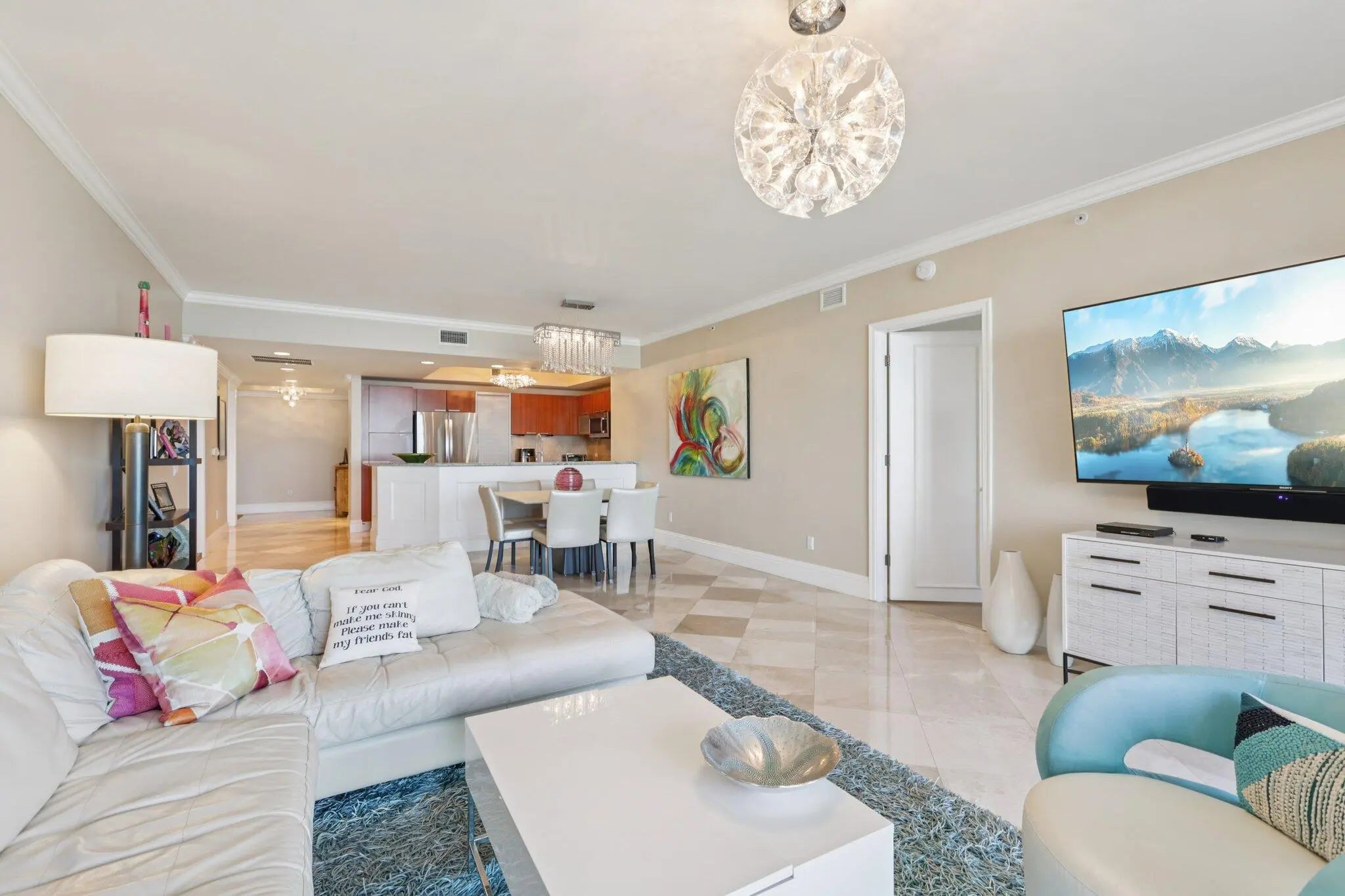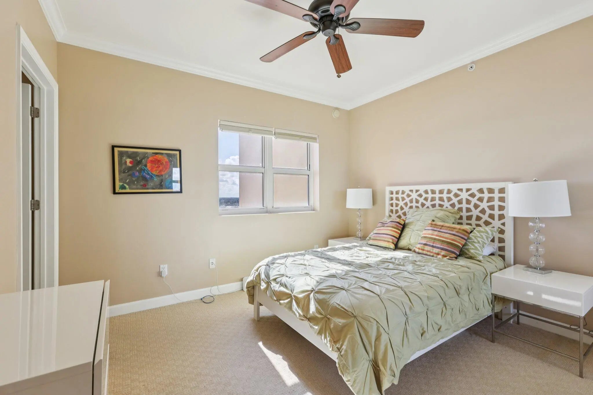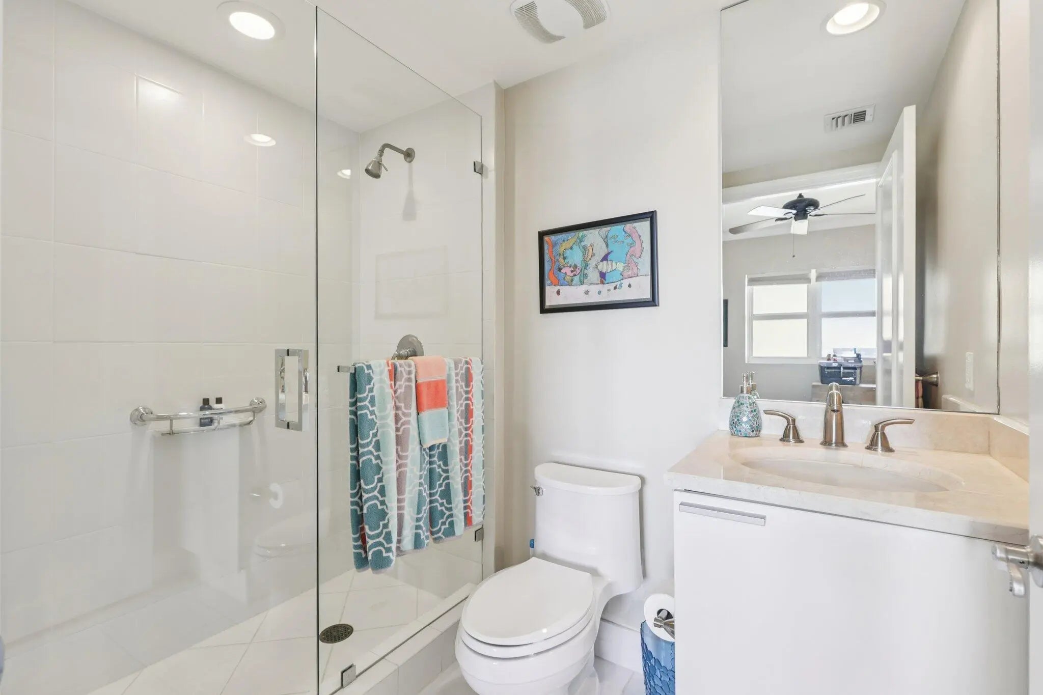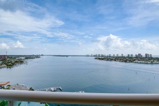 Desirable 14th-floor 3BR/3.5BA residence with expansive ocean and Intracoastal views. Spacious, well-designed floor plan offers water views from every room each with a private en-suite bath. Hurricane-impact windows and 9-ft floor-to-ceiling sliders open to a large private balcony. Travertine marble floors throughout with carpeted bedrooms for comfort. Updated kitchen with newer refrigerator, dishwasher, and polished granite counters. Additional upgrades include contemporary lighting, ceiling fans, decorative door mouldings, newer hardware, toilets, and custom frameless shower doors. Resort-style amenities include renovated pool deck with spa, fitness center, sauna/steam rooms, social and game rooms, pickleball, tennis, marina access, Publix across the street, & the beach over the bridge.