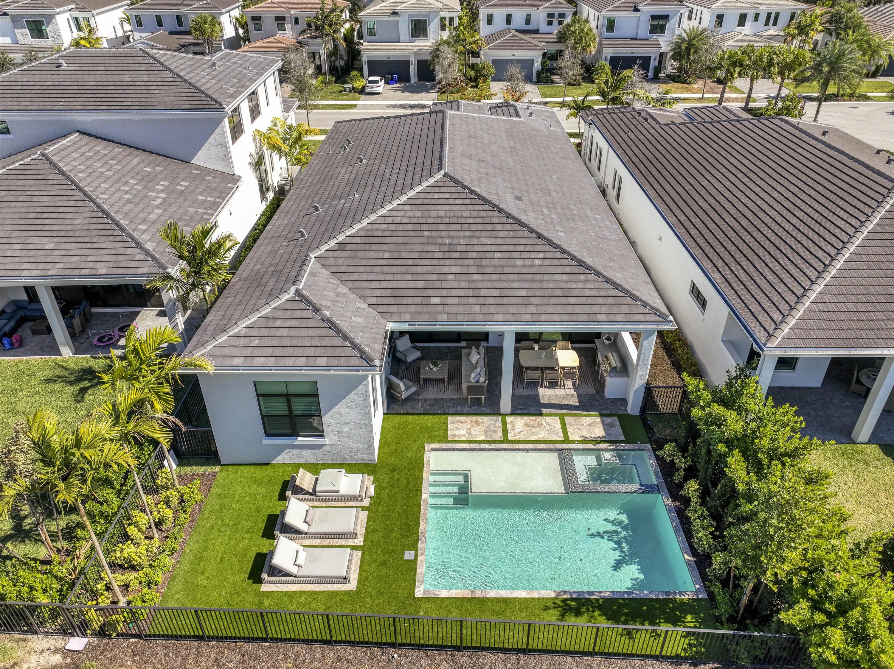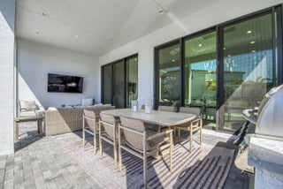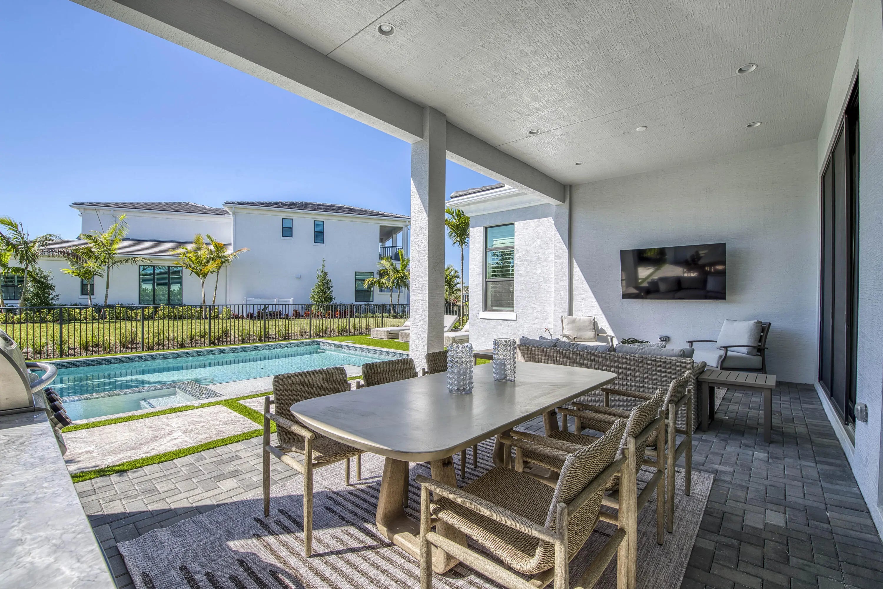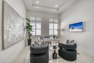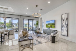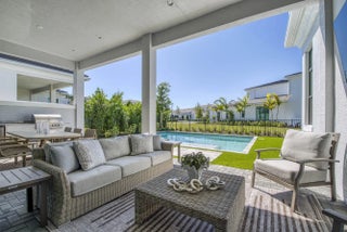 Welcome to this exquisite new construction residence in the gated community of Artistry in Palm Beach Gardens, where modern design and elevated finishes converge in a thoughtfully curated one-story floor plan. Offering 3 bedrooms, 3.5 baths, a private office, and a 3-car garage across 2,976 square feet under air, this home was crafted for both refined living and effortless entertaining. A seamless open layout unites the living, dining, and kitchen spaces, truly the heart of the home, accentuated by large-format tile flooring, custom lighting, 5'' baseboards, and a sophisticated linen-toned palette. The designer kitchen showcases custom white wood cabinetry, coordinating quartz countertops and backsplash, a premium stainless steel appliance package with gas cooktop, separate beverage refrigerator, and an expansive island with pull-up seating. Two oversized 10' sliding glass doors flood the space with natural light while framing views of the covered patio and resort-style pool and spa. The dedicated office, introduced by double doors and a recessed ceiling detail, provides a quiet and stylish workspace. All bedrooms feature en-suite baths and walk-in closets, with the primary suite serving as a true sanctuary. Its spa-inspired bath is appointed with a wall-to-wall dual vanity with center make-up station, floor-to-ceiling tile, soaking tub, glass-enclosed shower, bronze fixtures, and statement lighting. Outdoor living is equally compelling, highlighted by an expansive covered patio designed for year-round enjoyment. A fully equipped summer kitchen with built-in grill anchors the dining area, while the lounge space is prepped for a wall-mounted TV. The sparkling pool and integrated spa with sunshelf are surrounded by turf greenery and lush tropical landscaping, creating a private resort ambiance. Additional features include impact windows and doors, white plantation shutters, and a dedicated laundry room with sink and added storage. This exceptional residence offers the perfect blend of new construction peace of mind and sophisticated modern luxury in one of Palm Beach Gardens' most sought-after gated communities.