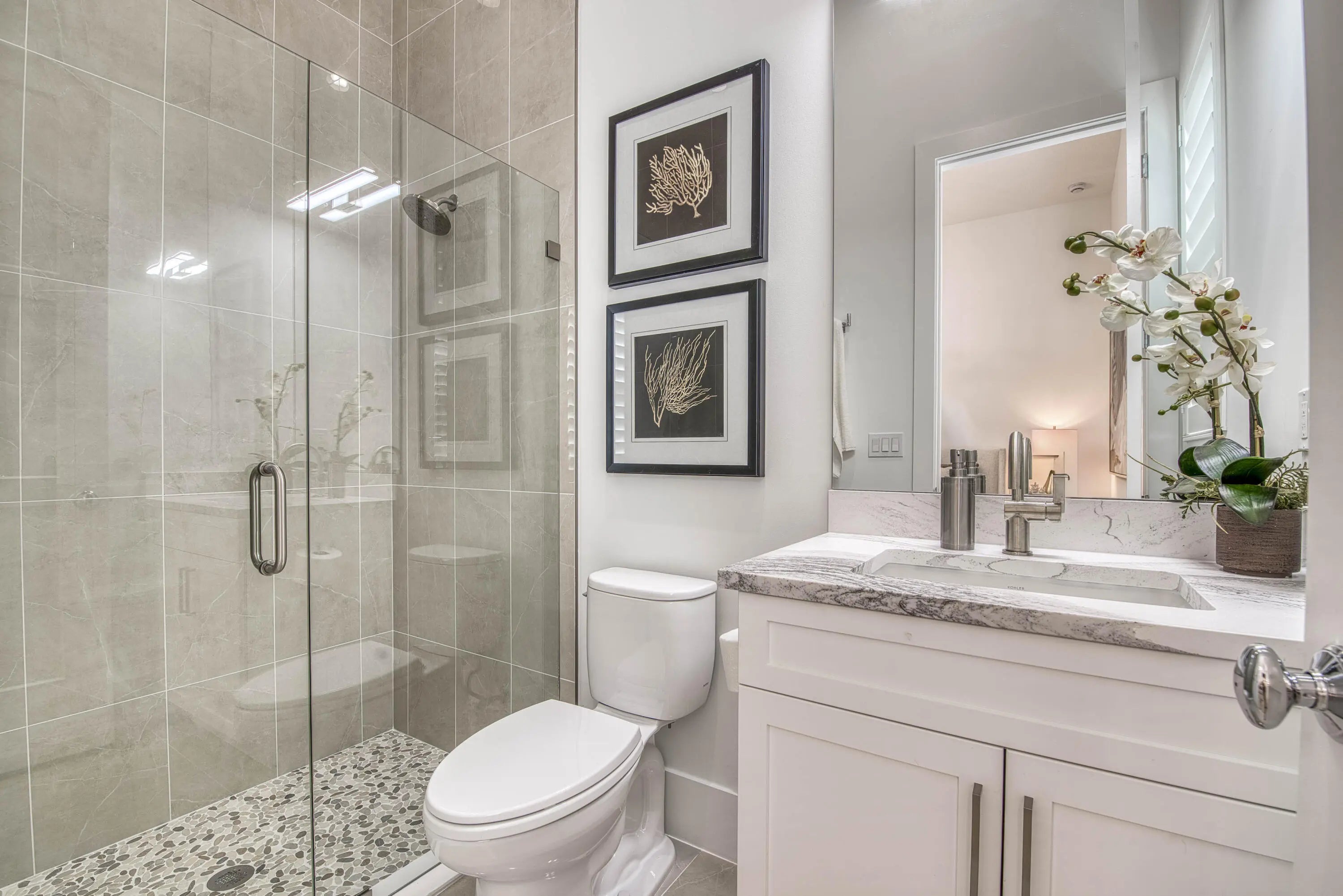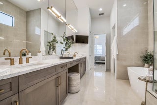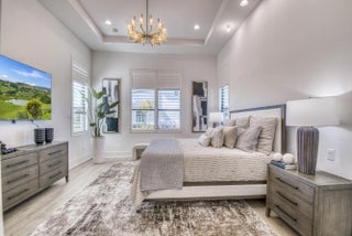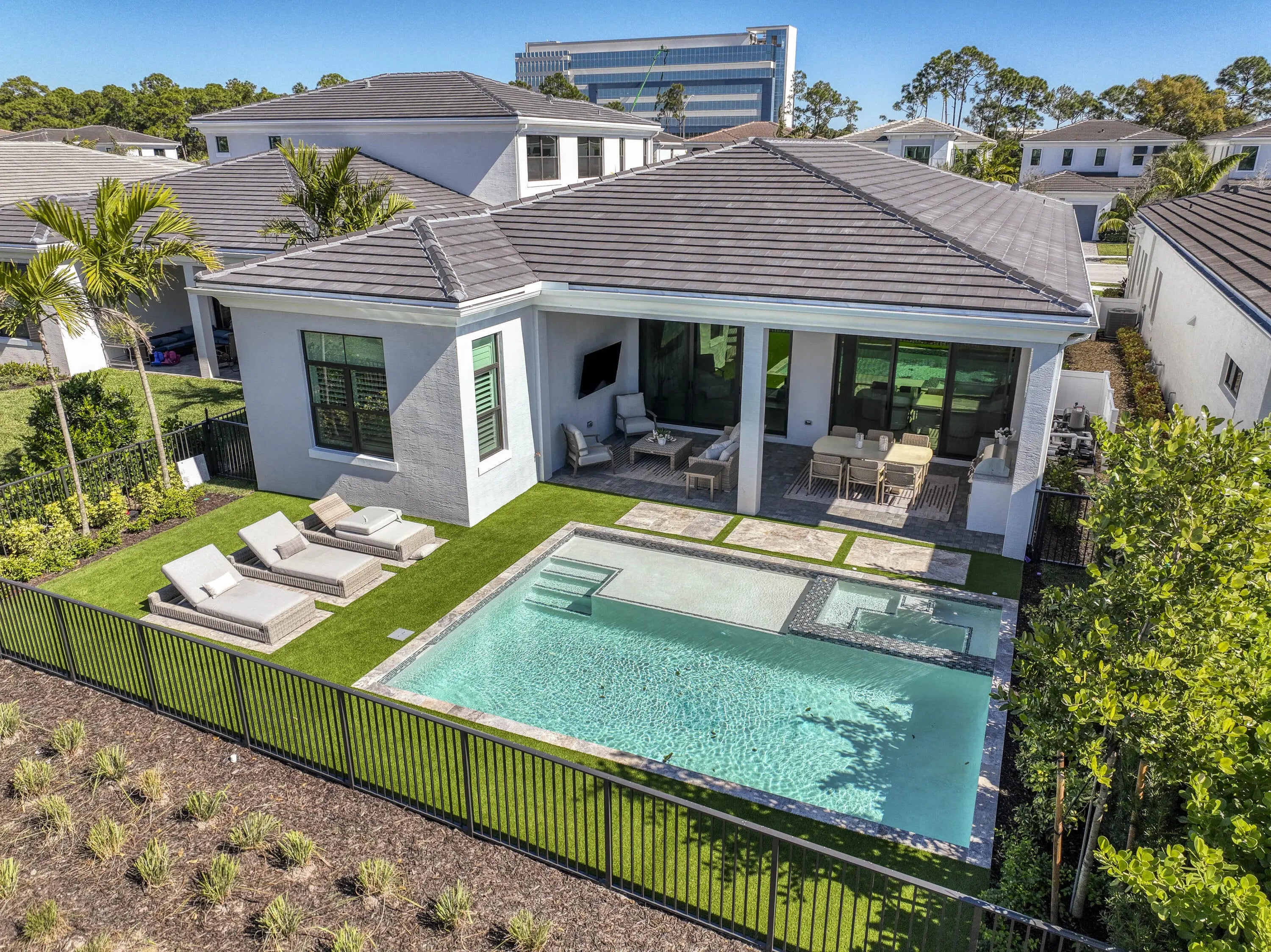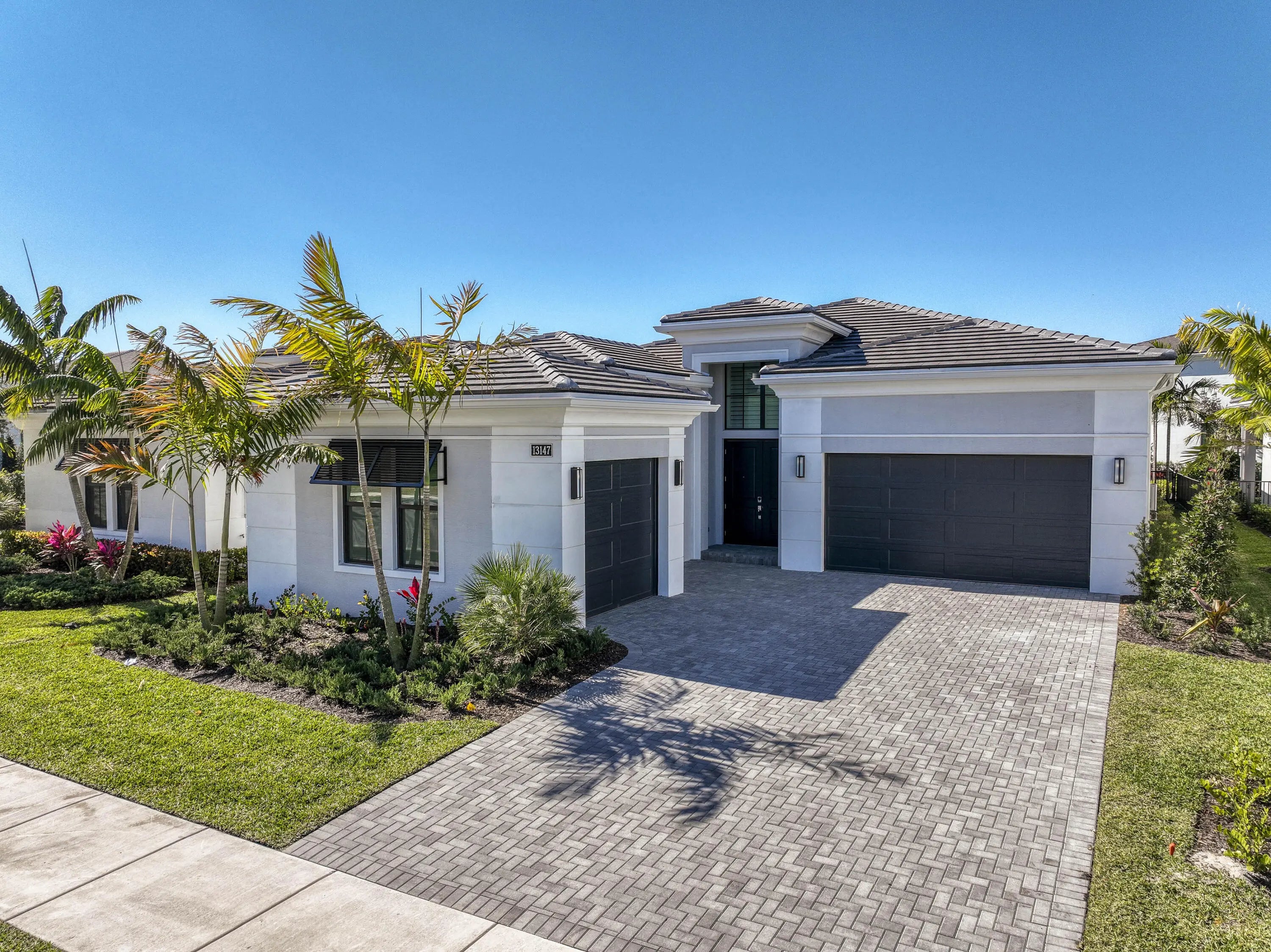 Welcome to this exquisite new construction residence in the gated community of Artistry in Palm Beach Gardens, where modern design and elevated finishes converge in a thoughtfully curated one-story floor plan. Offering 3 bedrooms, 3.5 baths, a private office, and a 3-car garage across 2,976 square feet under air, this home was crafted for both refined living and effortless entertaining. A seamless open layout unites the living, dining, and kitchen spaces, truly the heart of the home, accentuated by large-format tile flooring, custom lighting, 5'' baseboards, and a sophisticated linen-toned palette. The designer kitchen showcases custom white wood cabinetry, coordinating quartz countertops and backsplash, a premium stainless steel appliance package with gas cooktop, separate beverage refrigerator, and an expansive island with pull-up seating. Two oversized 10' sliding glass doors flood the space with natural light while framing views of the covered patio and resort-style pool and spa. The dedicated office, introduced by double doors and a recessed ceiling detail, provides a quiet and stylish workspace. All bedrooms feature en-suite baths and walk-in closets, with the primary suite serving as a true sanctuary. Its spa-inspired bath is appointed with a wall-to-wall dual vanity with center make-up station, floor-to-ceiling tile, soaking tub, glass-enclosed shower, bronze fixtures, and statement lighting. Outdoor living is equally compelling, highlighted by an expansive covered patio designed for year-round enjoyment. A fully equipped summer kitchen with built-in grill anchors the dining area, while the lounge space is prepped for a wall-mounted TV. The sparkling pool and integrated spa with sunshelf are surrounded by turf greenery and lush tropical landscaping, creating a private resort ambiance. Additional features include impact windows and doors, white plantation shutters, and a dedicated laundry room with sink and added storage. This exceptional residence offers the perfect blend of new construction peace of mind and sophisticated modern luxury in one of Palm Beach Gardens' most sought-after gated communities.