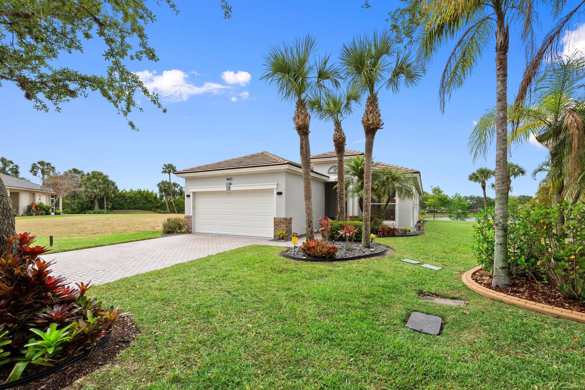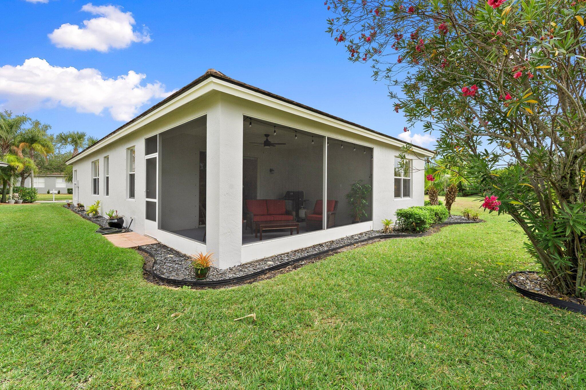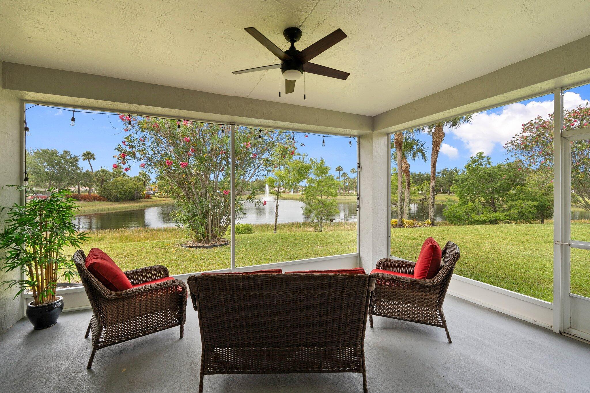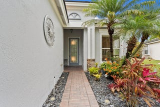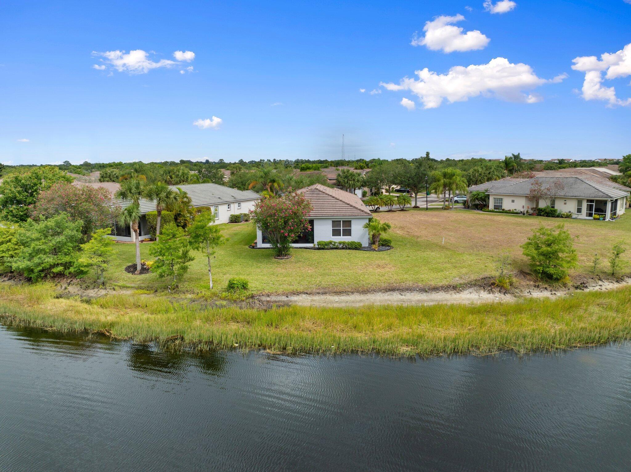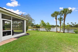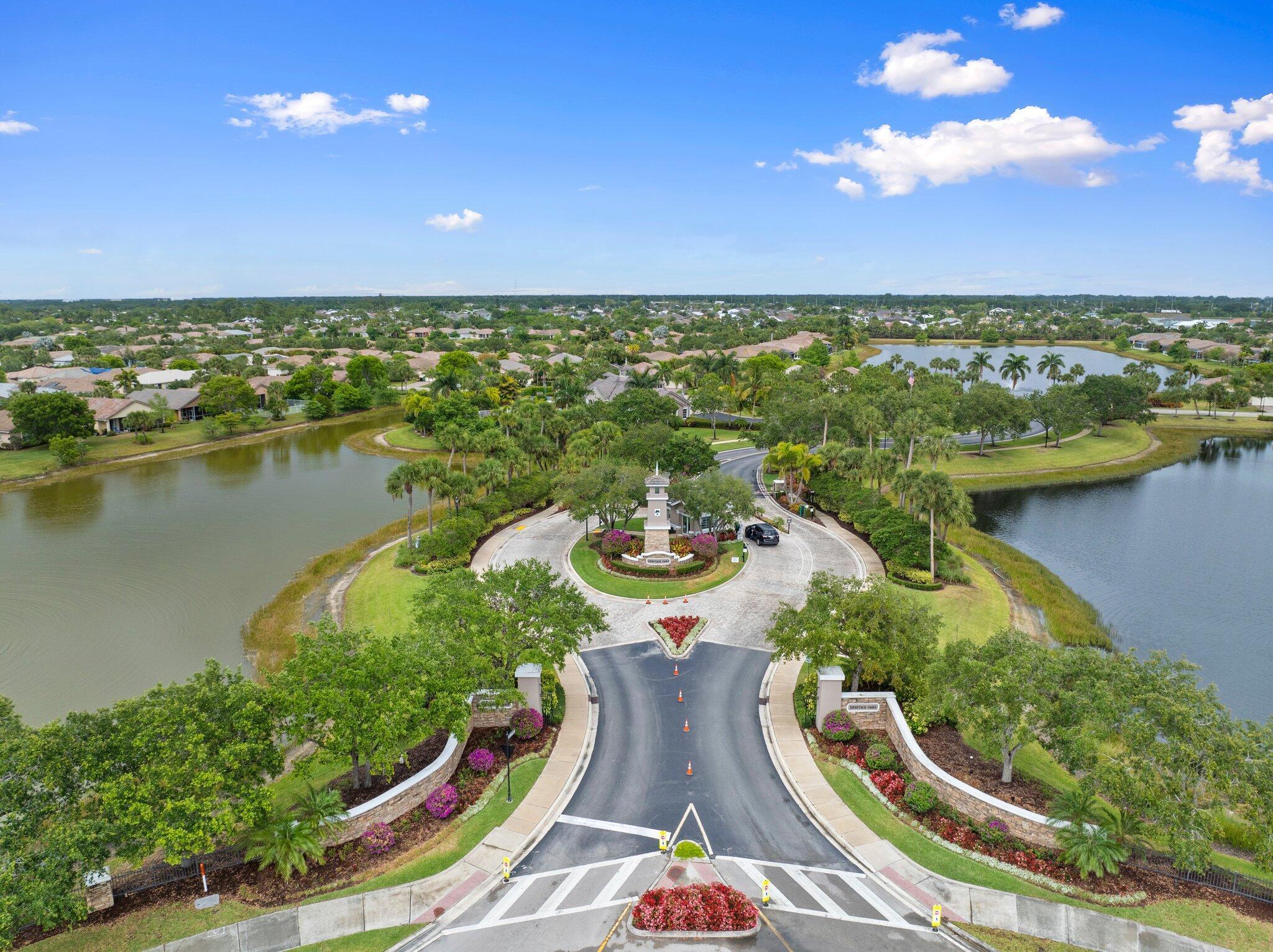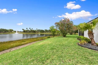 Move-in ready Victorian model in the gated Heritage Oaks community of Tradition, offering serene lake views and ultimate privacy. Situated on a pie-shaped, premium lot with no rear neighbors and an empty lot next door, this well-maintained 3-bedroom, 2-bathroom home features a bright, open floor plan with fresh interior and exterior paint, new carpet in the bedrooms, and tile throughout the main living areas. The spacious living and dining areas include a kitchen pass-through and an archway that leads to a breakfast nook with garden views. The updated kitchen showcases granite countertops, stainless steel appliances, a pantry, and recessed lighting. The generous master suite offers two walk-in closets, a tray ceiling, and an ensuite bath with dual vanities, a separate soaking tub, and alarge walk-in shower. Two guest bedrooms and a full bath are located at the front of the home, providing ideal separation for privacy. Enjoy outdoor living on the covered, screened-in patio overlooking the tranquil lake. Additional features include a laundry room, epoxy-coated 2-car garage floor, new hot water heater, and vibrant landscaping. Heritage Oaks amenities include a clubhouse, resort-style pool, hot tub, fitness center, and social room. HOA fees cover lawn maintenance, basic cable, and internet. Conveniently located minutes from I-95, Cleveland Clinic, and all the shopping, dining, and entertainment that Tradition has to offer.