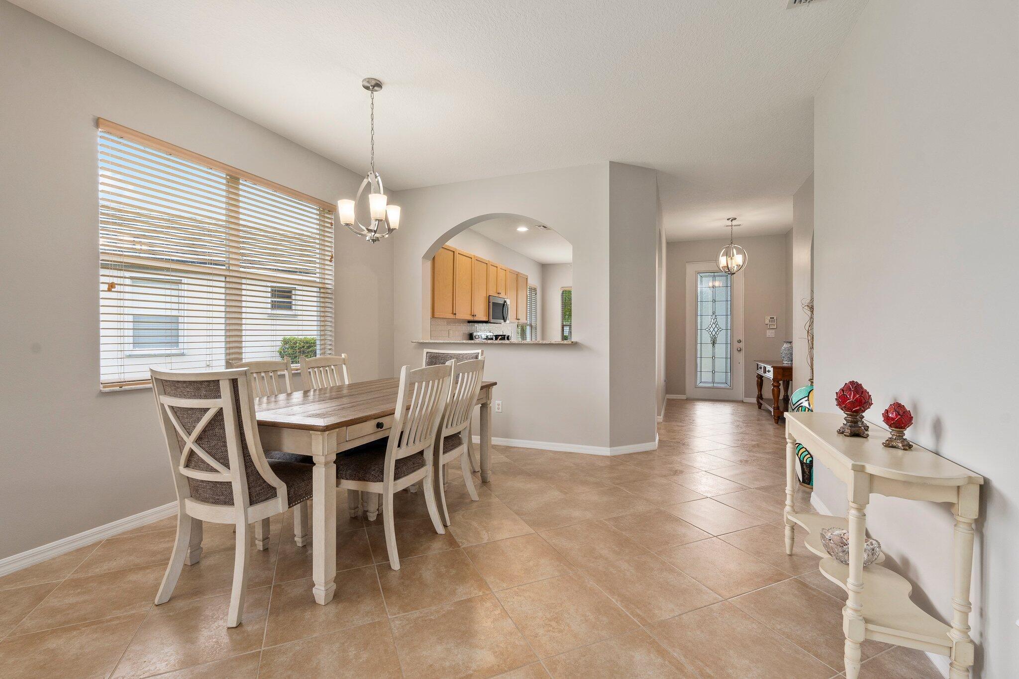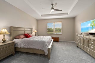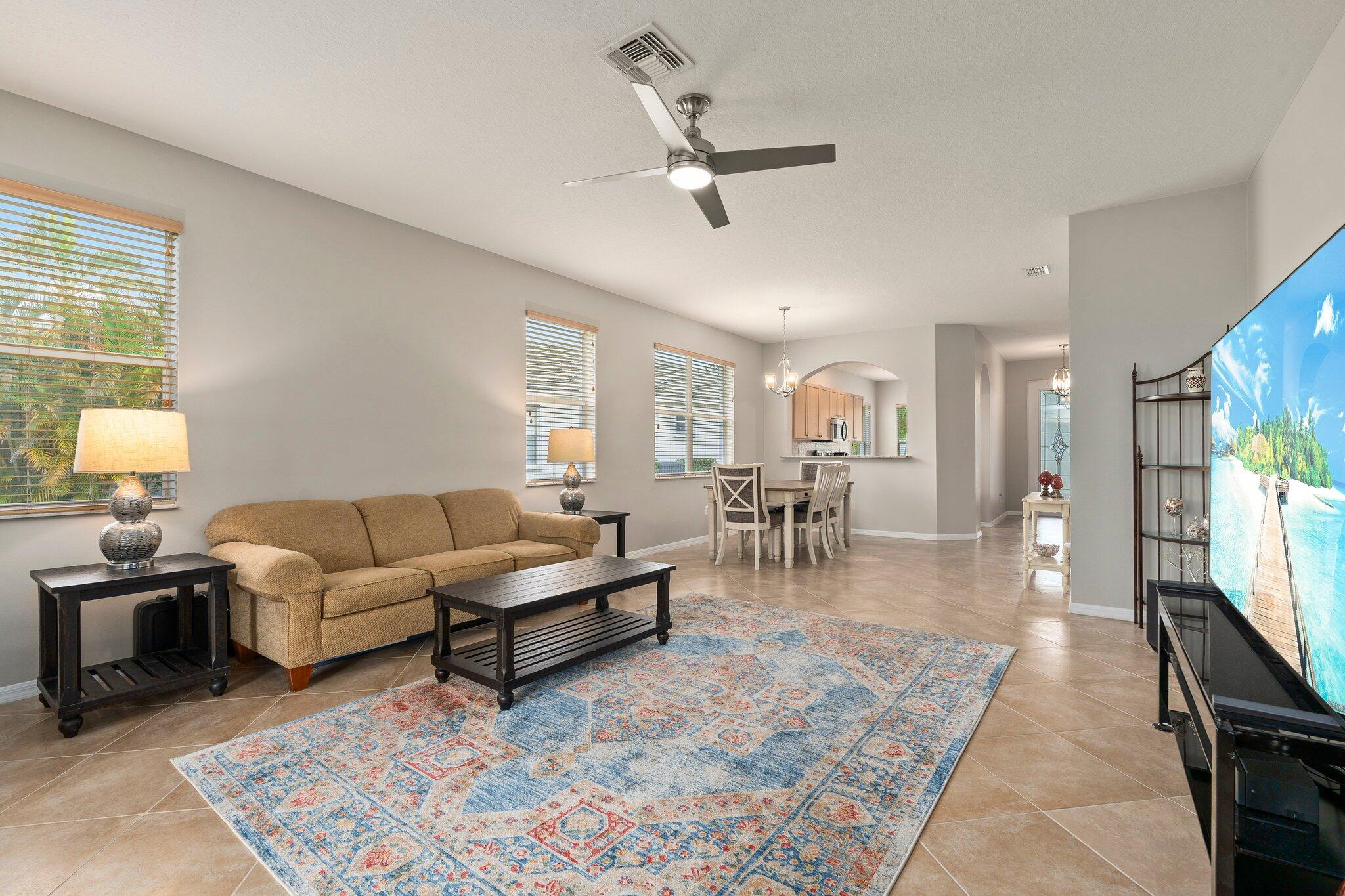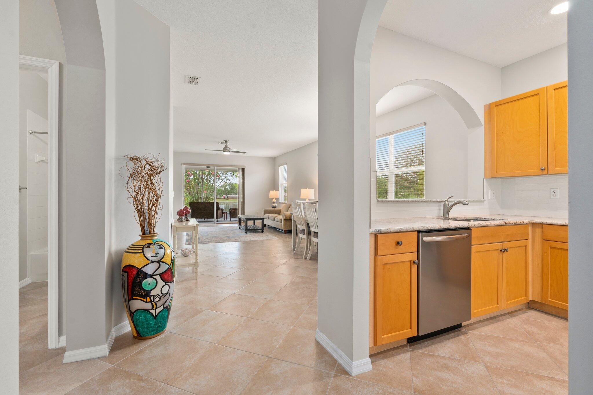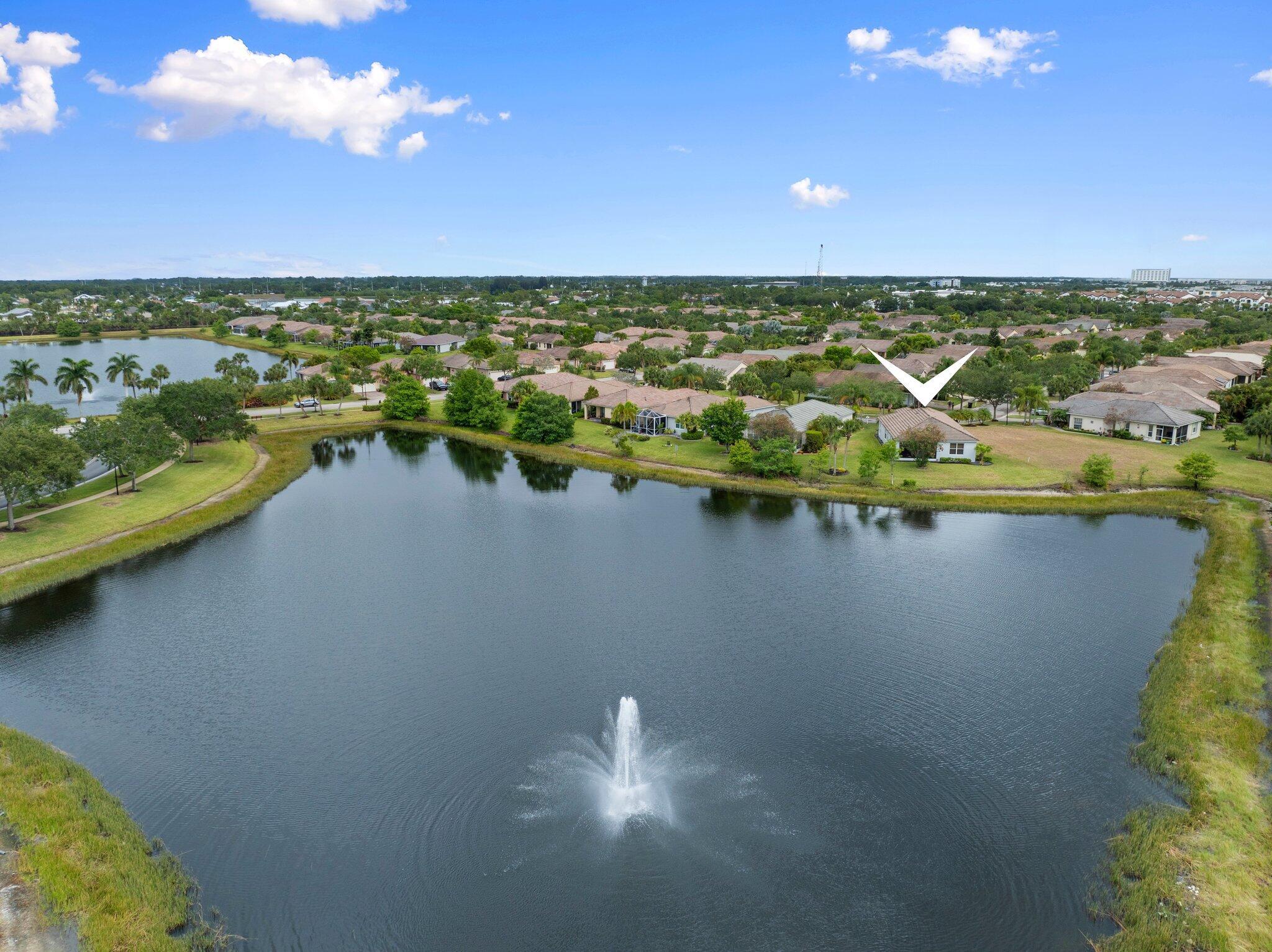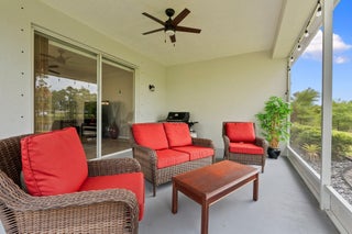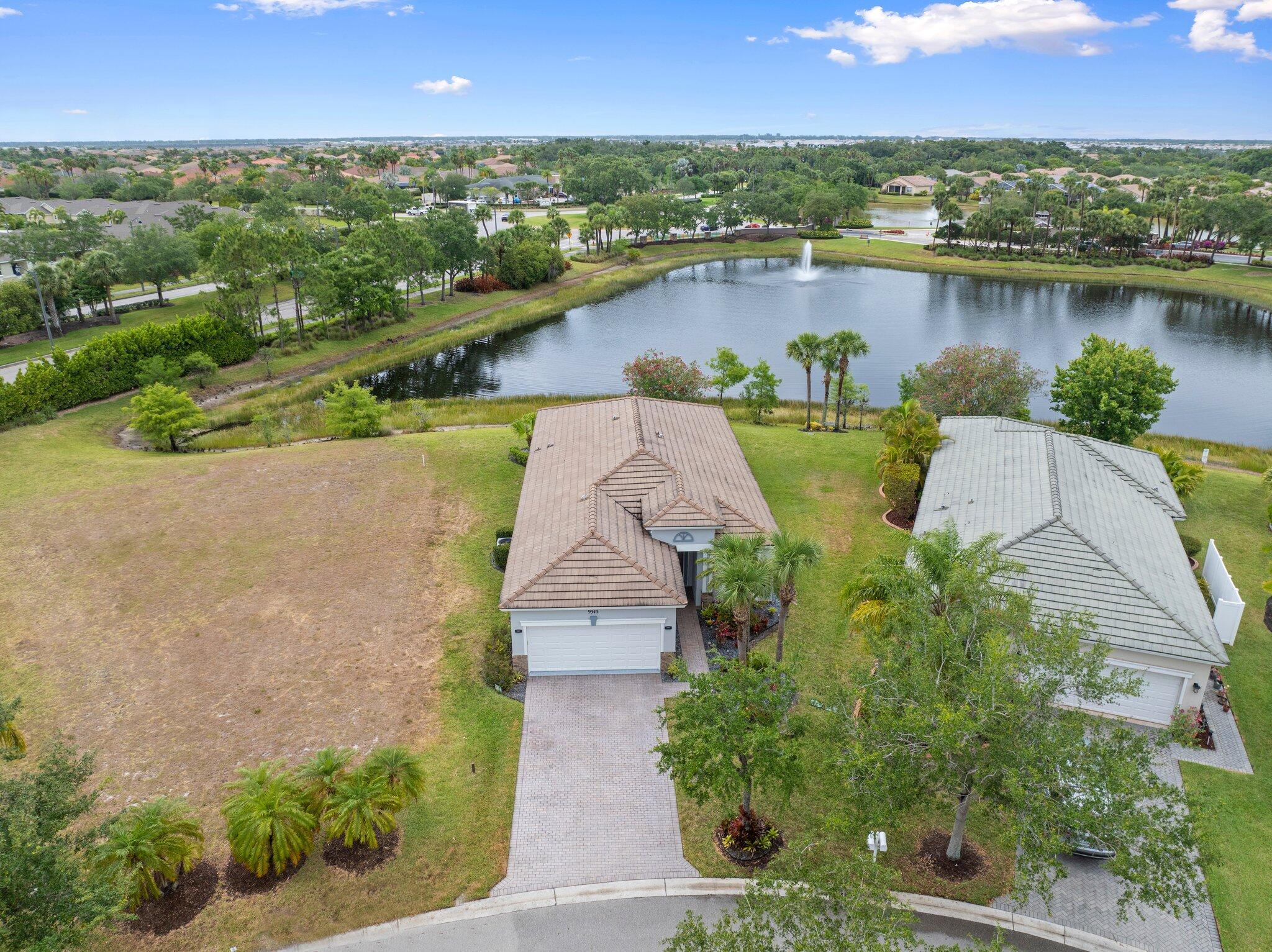 Move-in ready Victorian model in the gated Heritage Oaks community of Tradition, offering serene lake views and ultimate privacy. Situated on a pie-shaped, premium lot with no rear neighbors and an empty lot next door, this well-maintained 3-bedroom, 2-bathroom home features a bright, open floor plan with fresh interior and exterior paint, new carpet in the bedrooms, and tile throughout the main living areas. The spacious living and dining areas include a kitchen pass-through and an archway that leads to a breakfast nook with garden views. The updated kitchen showcases granite countertops, stainless steel appliances, a pantry, and recessed lighting. The generous master suite offers two walk-in closets, a tray ceiling, and an ensuite bath with dual vanities, a separate soaking tub, and alarge walk-in shower. Two guest bedrooms and a full bath are located at the front of the home, providing ideal separation for privacy. Enjoy outdoor living on the covered, screened-in patio overlooking the tranquil lake. Additional features include a laundry room, epoxy-coated 2-car garage floor, new hot water heater, and vibrant landscaping. Heritage Oaks amenities include a clubhouse, resort-style pool, hot tub, fitness center, and social room. HOA fees cover lawn maintenance, basic cable, and internet. Conveniently located minutes from I-95, Cleveland Clinic, and all the shopping, dining, and entertainment that Tradition has to offer.