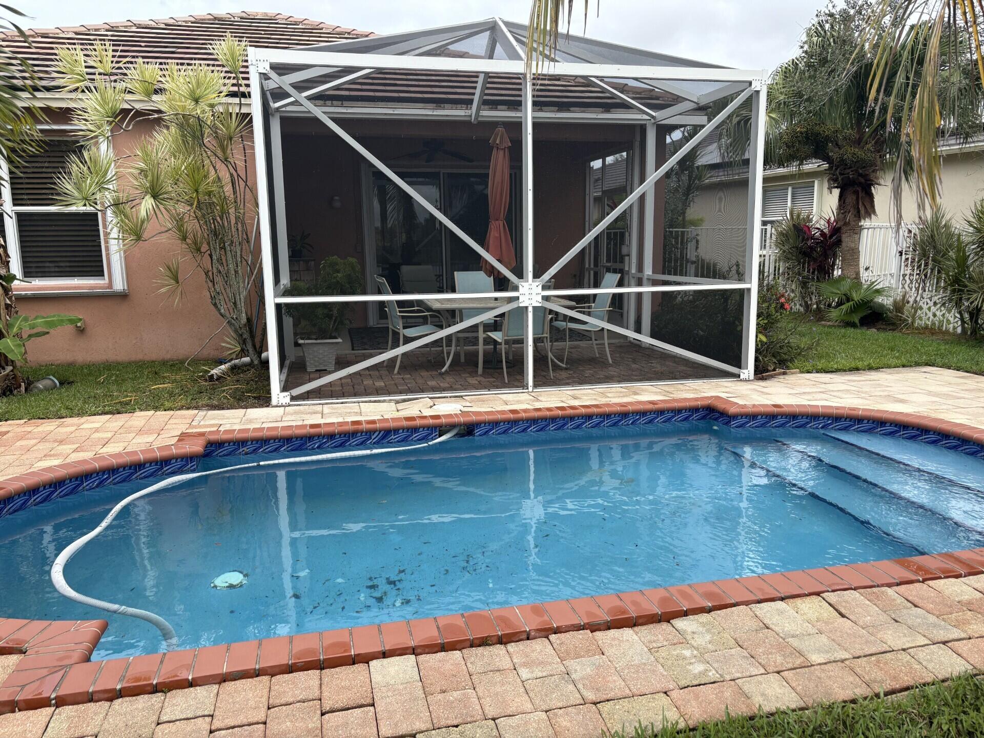 Waterfront Pool home with 2 bedrooms plus a Den/Office/3rd Bedroom. 2006 Roof. 2023 Water Heater. Large open eat-in kitchen with lots of counter space. Formal Dining area. Covered patio and screened lanai dining overlooks the inground pool. Full time Property Manager onsite.