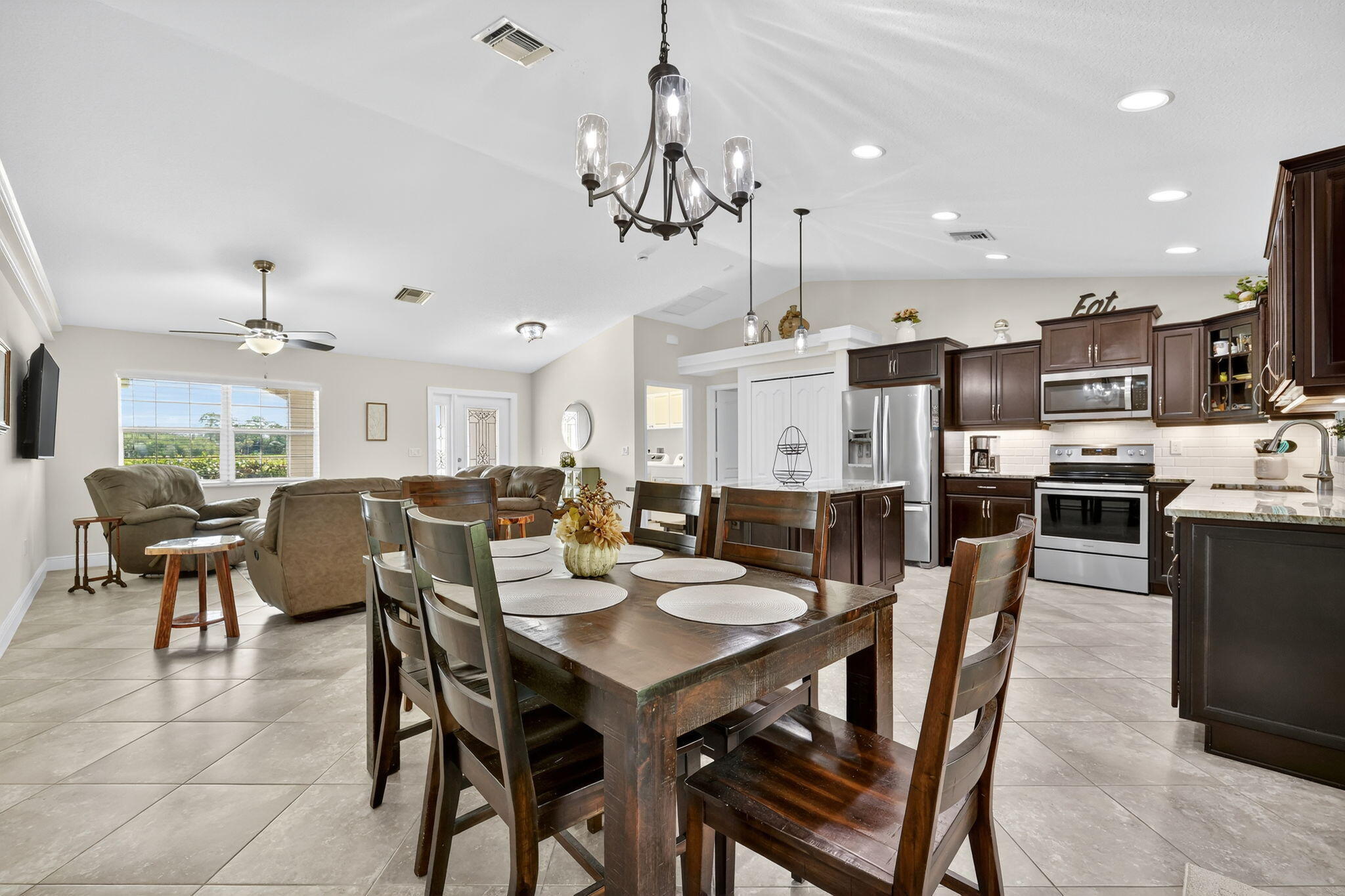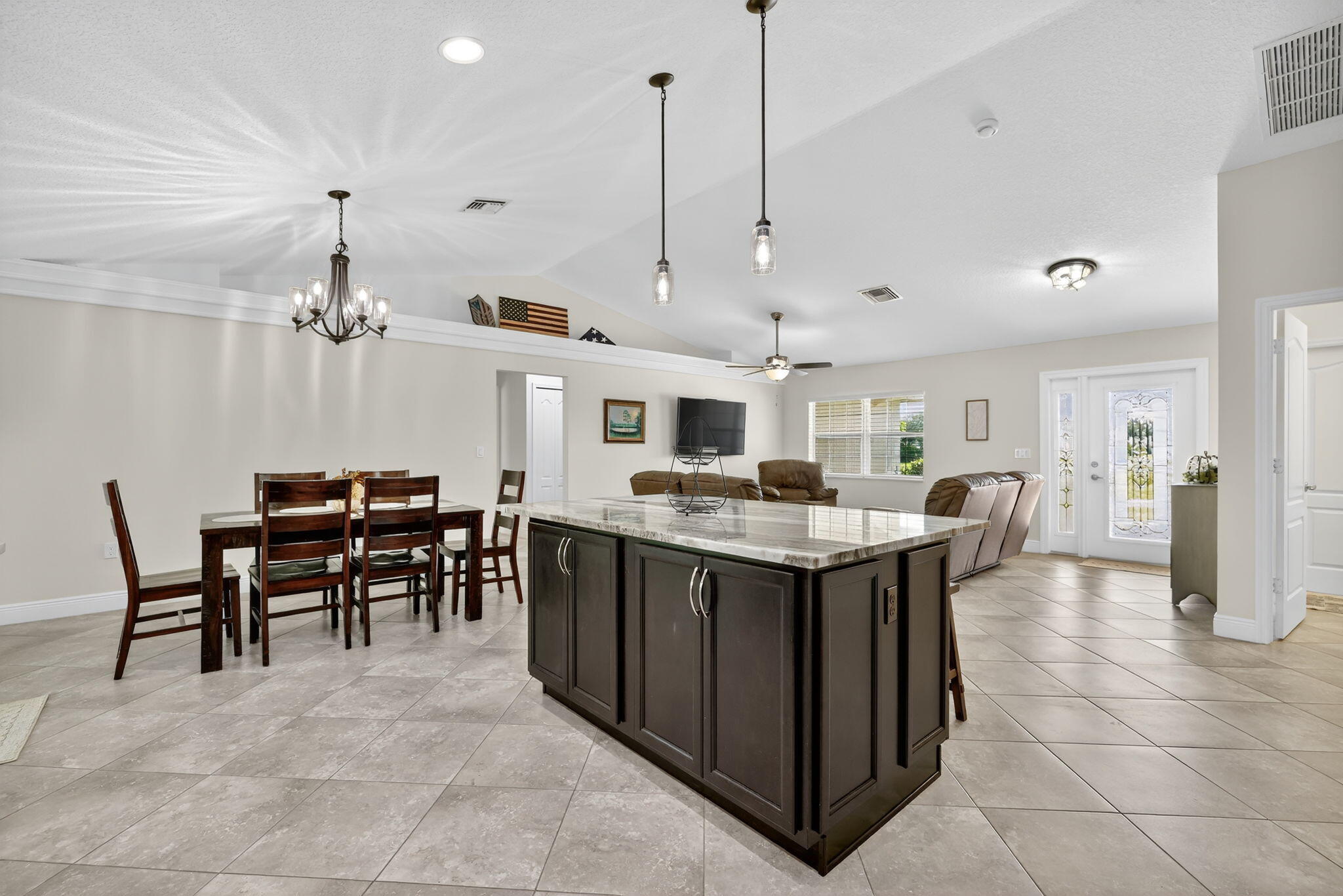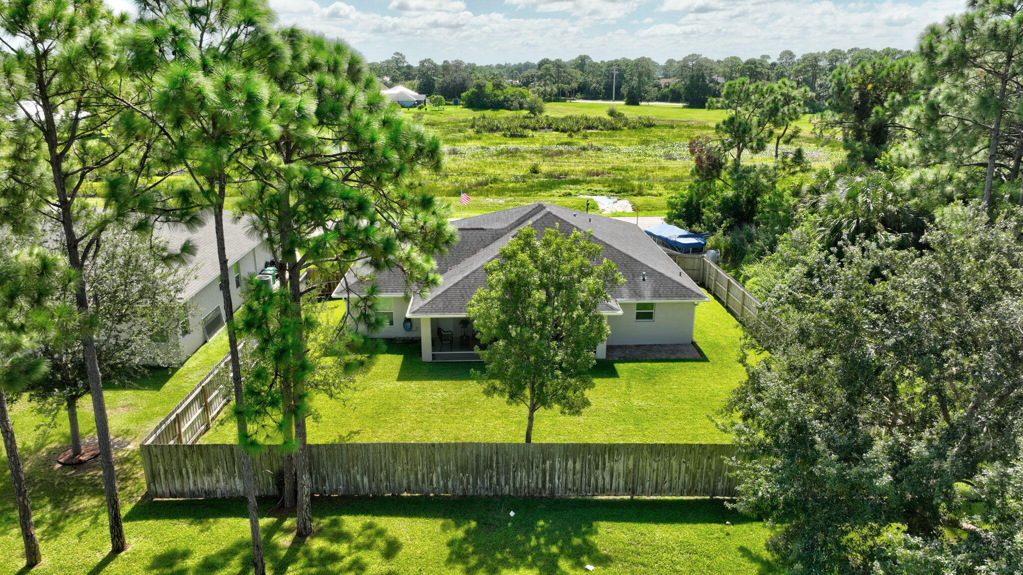 Welcome to this meticulously maintained 4-bedroom, 2-bath, 2-car garage home, built in 2019 by Grande Construction with NO HOA! This CBS-constructed home offers peace of mind with full impact windows and sliders and is situated on just under a quarter acre with tranquil preserve views--no homes will ever be built in front. Interior Features:-Open-concept design with a spacious Great Room, dining area, and modern kitchen-Gourmet kitchen with granite countertops, pendant lighting, abundant cabinetry, large island with counter seating, and expansive pantry.-Primary Suite with double-coffered ceiling, laminate flooring, large walk-in closet, and luxurious en-suite featuring dual granite vanities, an upgraded tiled shower, and soaking tub.-Split floor plan with 3 guest bedrooms,each with wall-to-wall closets, ceiling fans, and pre-wired for cable -Cabana bath with granite countertop and direct access to screened patio Enjoy the outdoors on your very own expansive screened-in patio overlooking the backyard or the covered front porch overlooking the preserve perfect for enjoying your morning coffee. Screened in patio offers recessed lighting and ceiling fans, making it perfect for entertaining. Fully fenced large backyard with room for a pool Additional Upgrades & Conveniences: Crown molding, 18x18 ceramic tile, and wood cabinetry with soft-close drawers, Interior laundry room with cabinets, washer/dryer, and pull-down attic access Security system, irrigation system with well & Rainbird technology, flood lights, and exterior coach lights. TMI brand impact glass & doors, Carrier AC system, and garage floor sealed with H&C stain Amazing location! Plenty of room for a boat or motor home. Vacant lot to the left and no homes can ever be built in front. All TV's convey with sale and furniture is negotiable. Ideally located just minutes to schools, shopping, dining, golf, Mets Spring Training, IRSC, medical facilities, and entertainment.