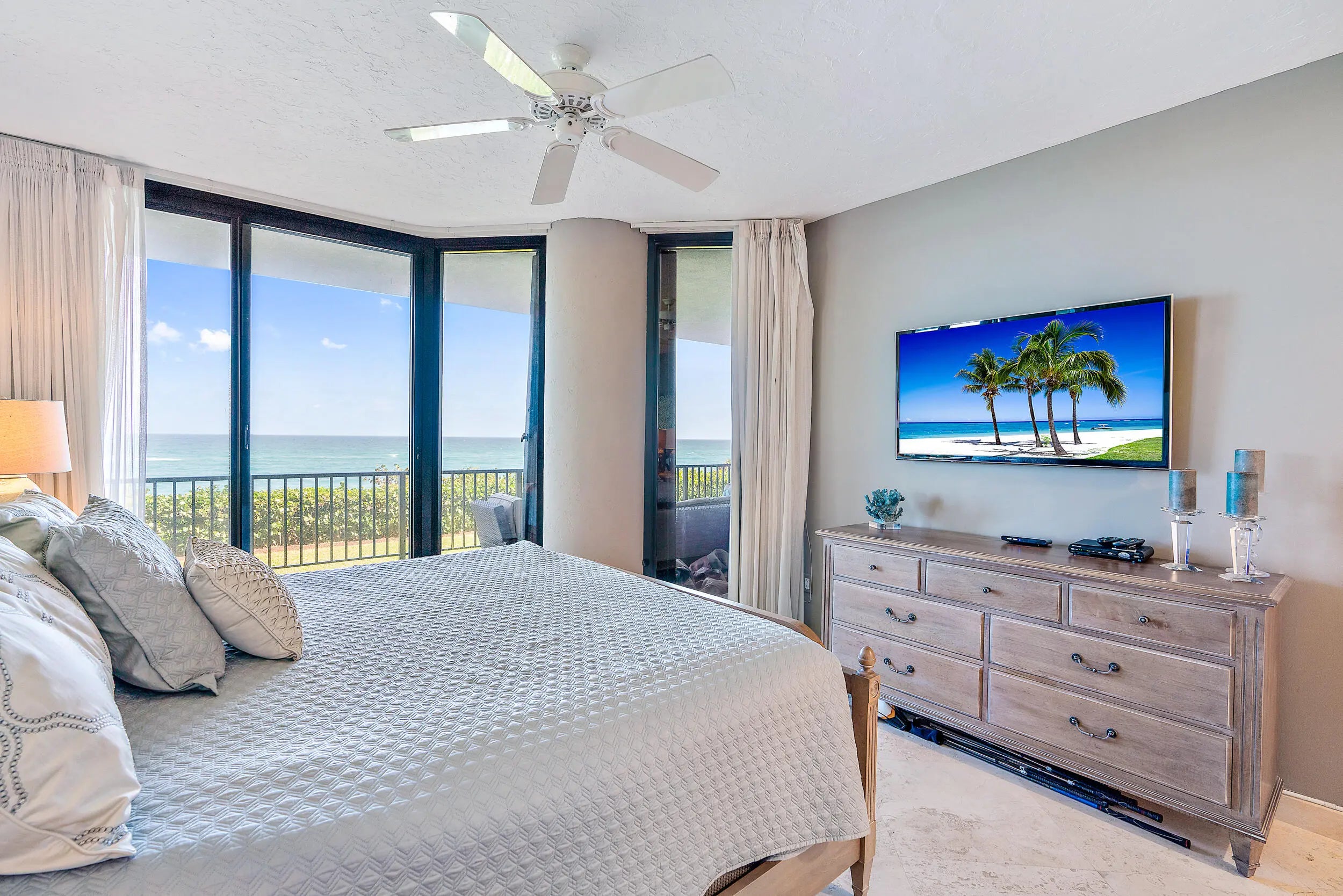 Experience luxury living in this 3 bedroom direct oceanfront condo w/private elevator entry. Enjoy breathtaking ocean views from the oversized balcony off the living room and master suite. 3rd BR has desk & pull out couch. This beautifully upgraded unit features travertine marble flooring, granite kitchen w/ custom glass tile backsplash, Viking cooktop, GE Monogram appliances, wine cooler & bar, sound system, art lighting, water filtration system, and plantation shutters. Building amenities include a pool, spa, wine room, fitness center & on-site manager. Available 11/1/2026 for a 6 month off-season lease only. Pool cabana is extra. Close to fine restaurants and shopping. Don't miss out on this beauty!
