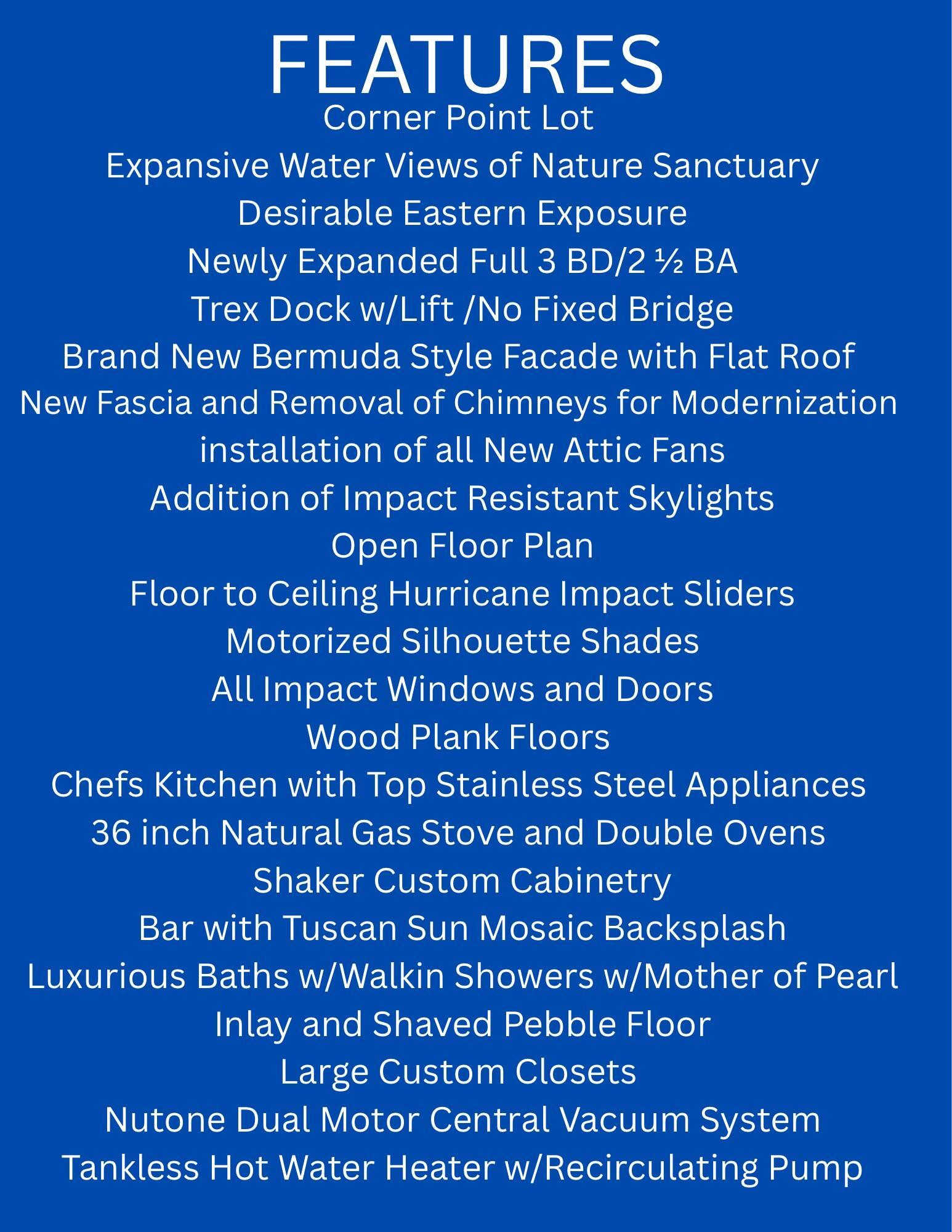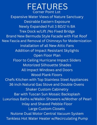 FEELS LIKE YOU ARE ON A YACHT! Wide open panoramic water views capturing the nature sanctuary and tranquil blue waters. Rare opportunity to own a full 3 BD/2 1/2 Bath recently expanded harbor home w/every imaginable upgrade. Corner point lot. Floor to ceiling impact sliders. Open floor plan. Split bedrooms. Large plank wood floors. Motorized shades. Custom California closets throughout. Chefs kitchen w/custom European cabinetry, imported mosaic backsplash, top stainless steel appliances, gas cooktop. Large Center island w/breakfast bar. Big pantry. Primary suite boasts 3 huge closets.Private deeded dock for up to 40 ft boat. No fixed bridge. Desirable east exposure. GOLF or SPORTS membership available. BRAND NEW Bermuda style roof and facade. Garage w/epoxy floor and storage.