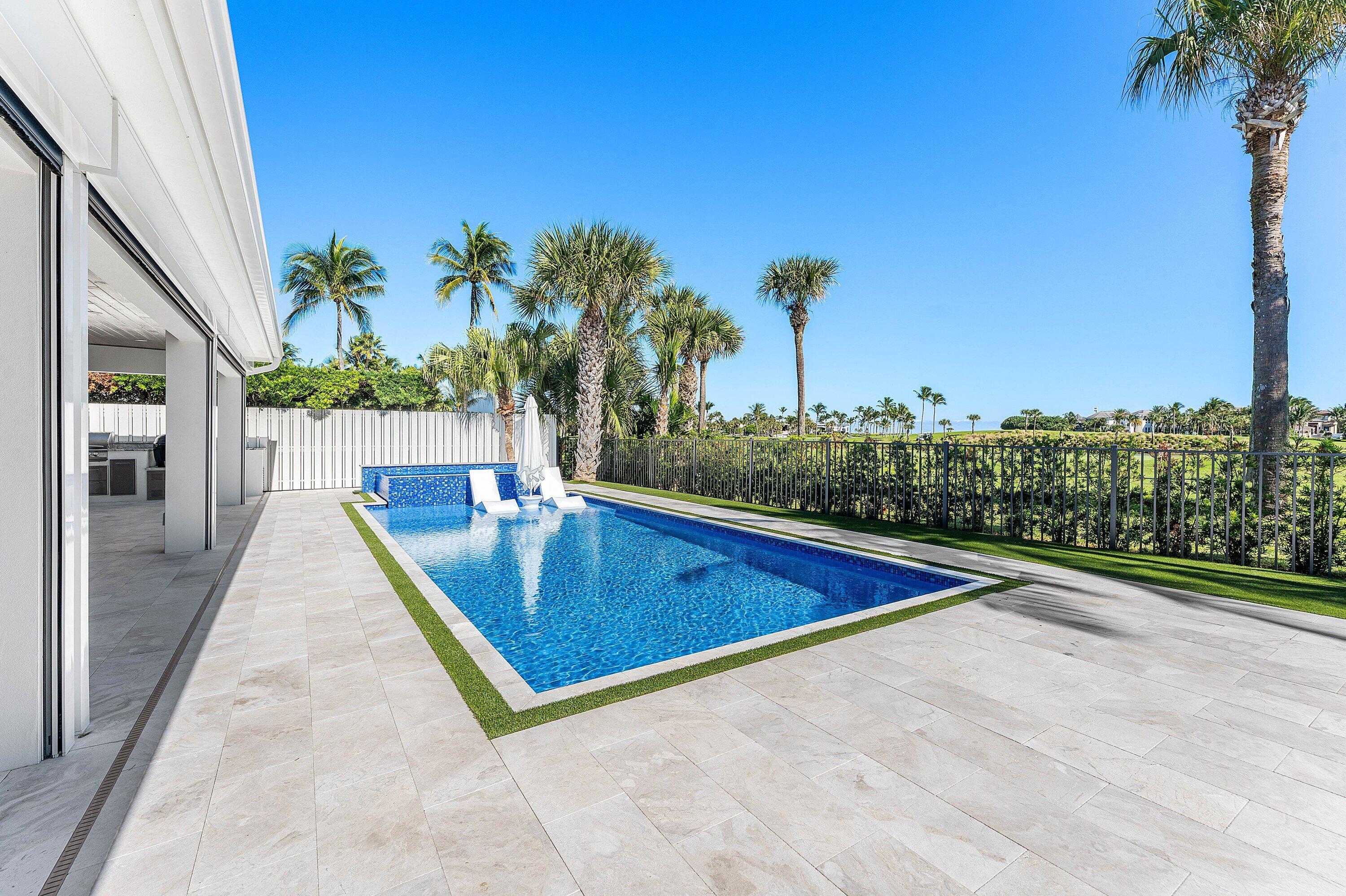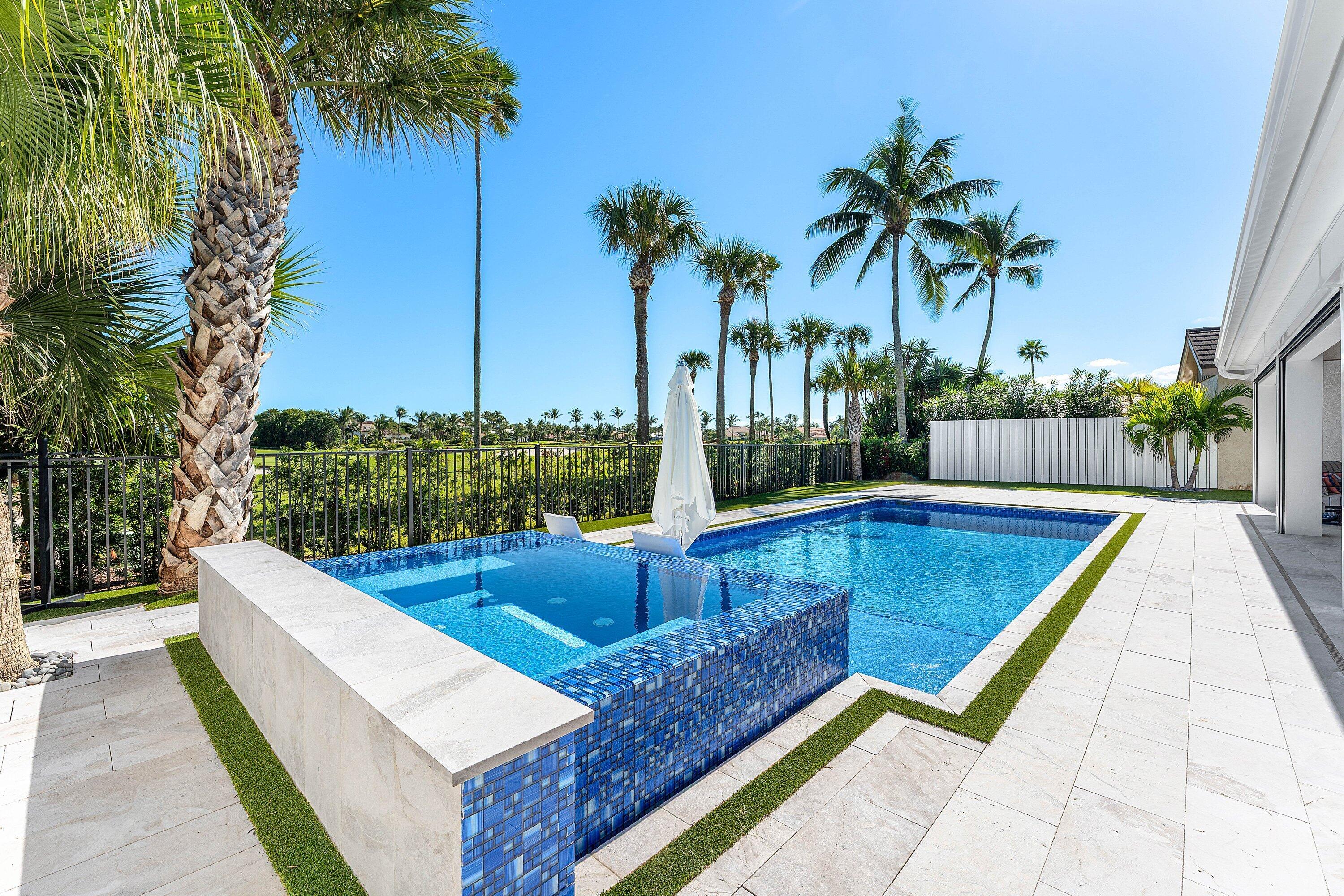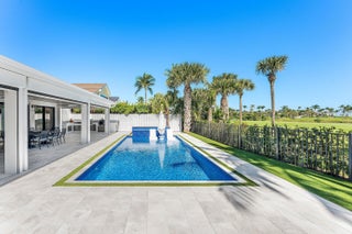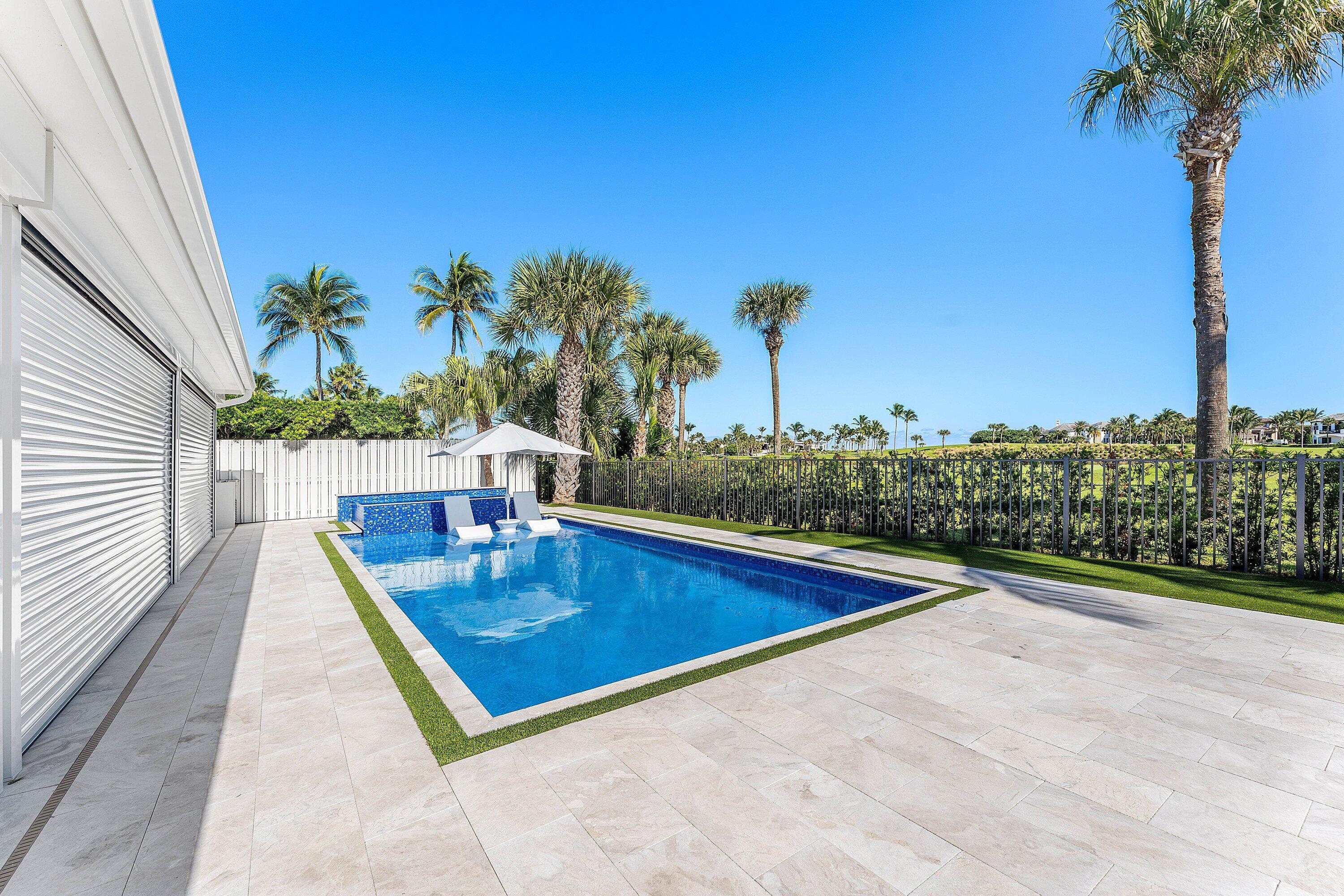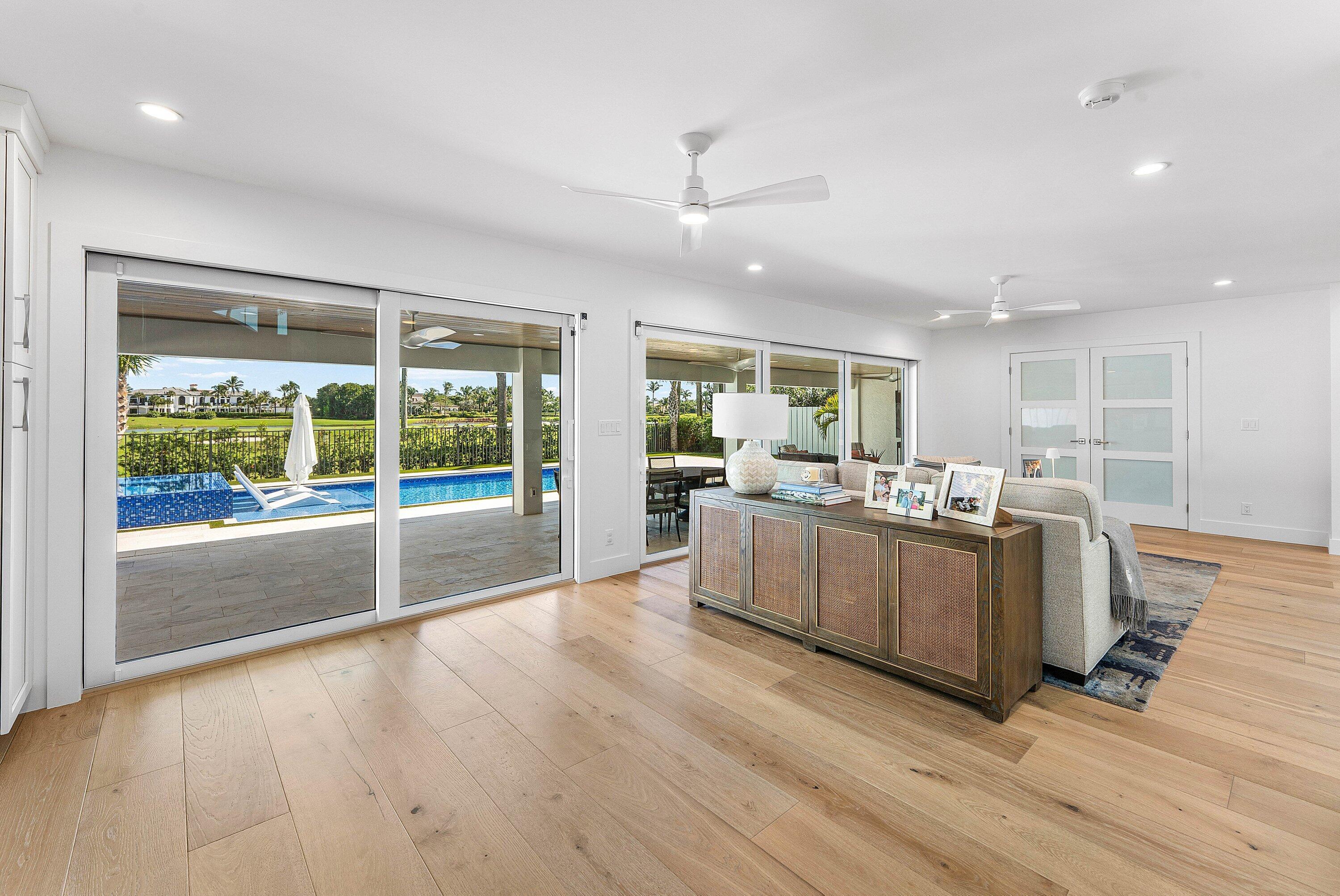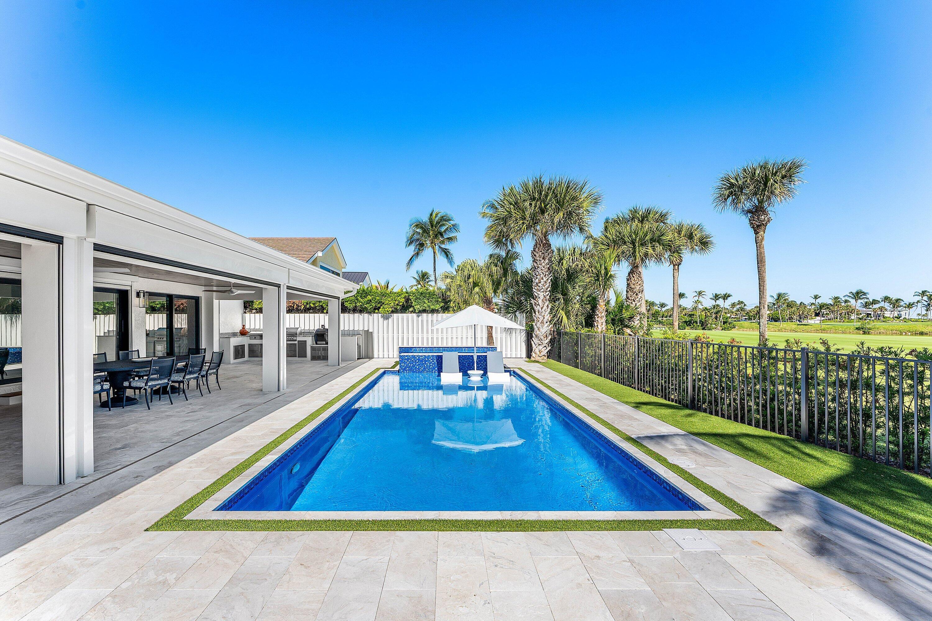 Completely gut-renovated three-bedroom, four-bathroom golf course home featuring a brand-new kitchen, new bathrooms, new flooring throughout, a new roof, new generator, and a newly built pool with an expansive deck.