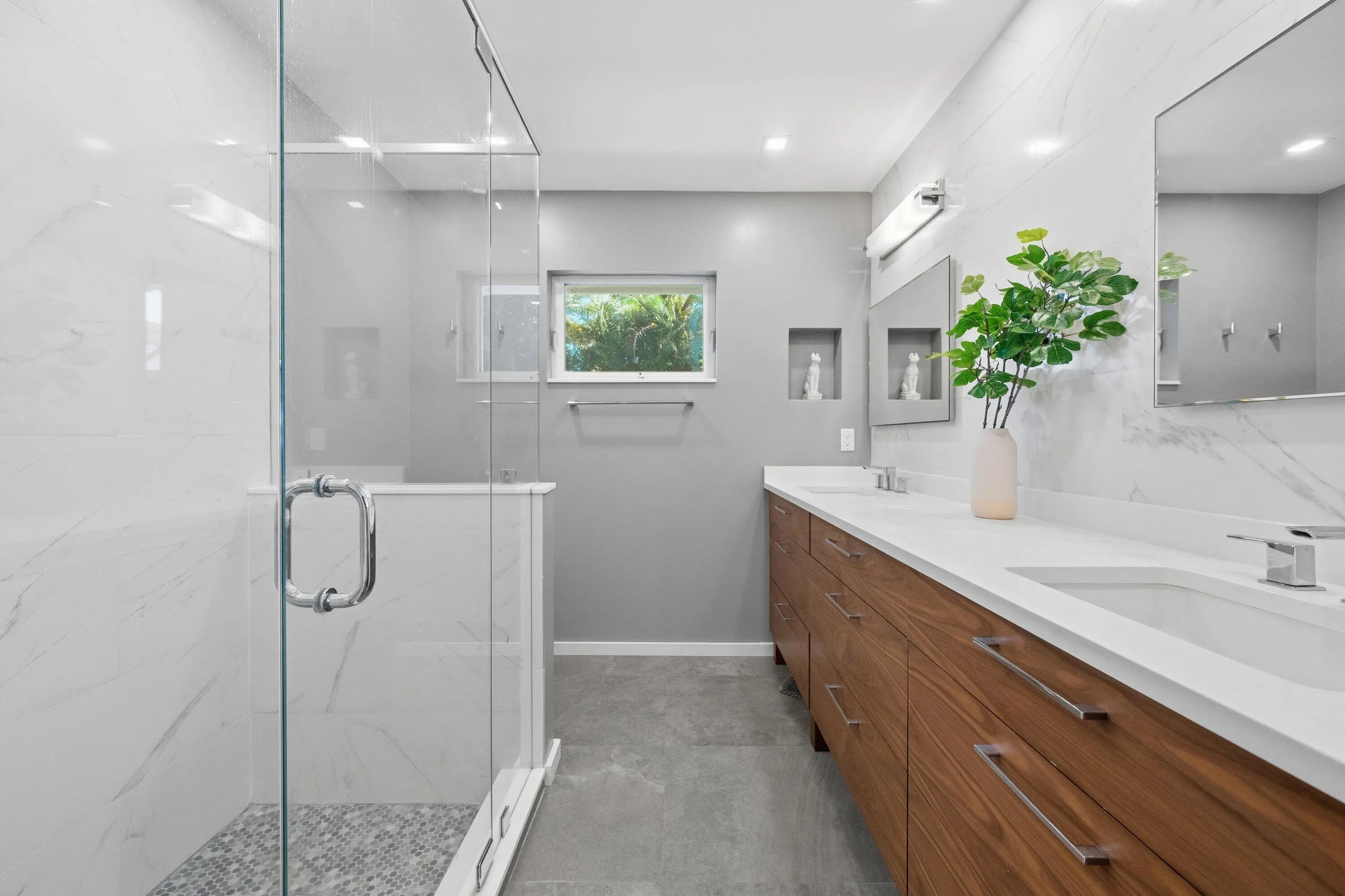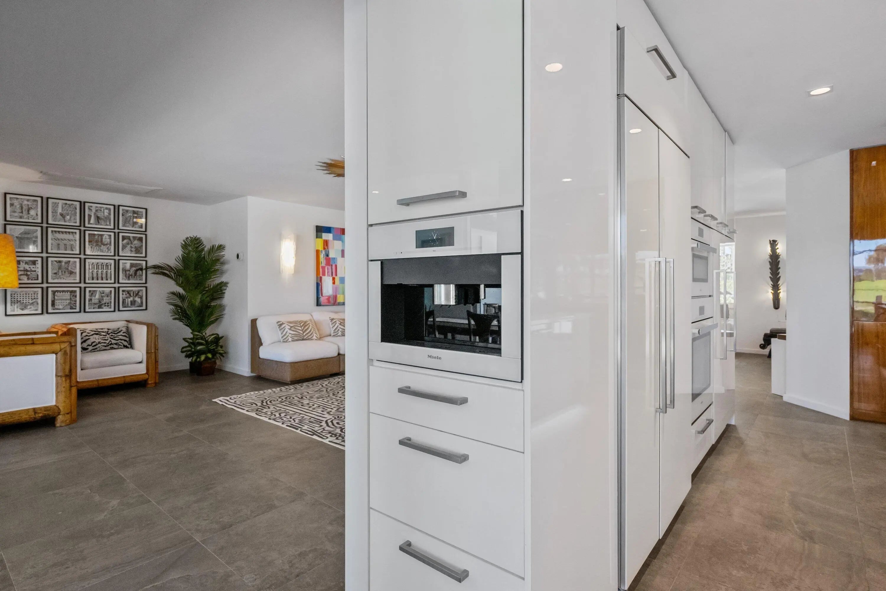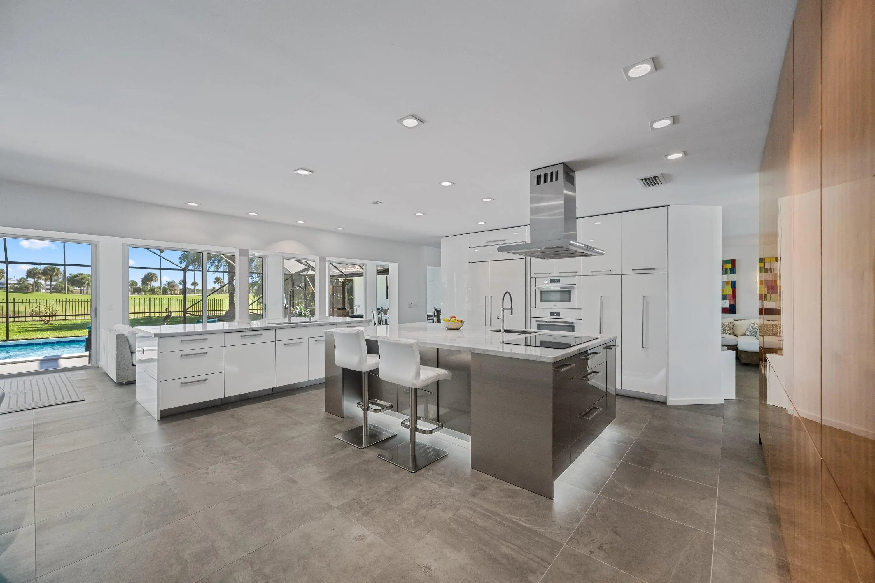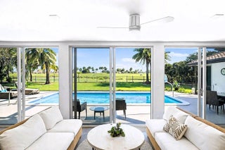 Tour this open concept floor plan home that will not disappoint! CBS Construction, no flood zone! Once entering, you are immediately greeted by spectacular views of the pool and golf course. The modern kitchen with top-of-the line appliances including a built-in Miele coffee station and tons of storage is a chef's dream. The home was modernized to perfection and is perfect for entertaining. The screen enclosure will be removed late March as depicted on 2 AI generated images. Both master bedroom and the north-side guest room have en-suite baths and lead directly to the pool deck. The glass garage door brings in natural light. Being only 2 lots away from the shortcut to the Country Club makes this a very desirable location. Please see attachments for a detailed feature sheet and floor plan.
