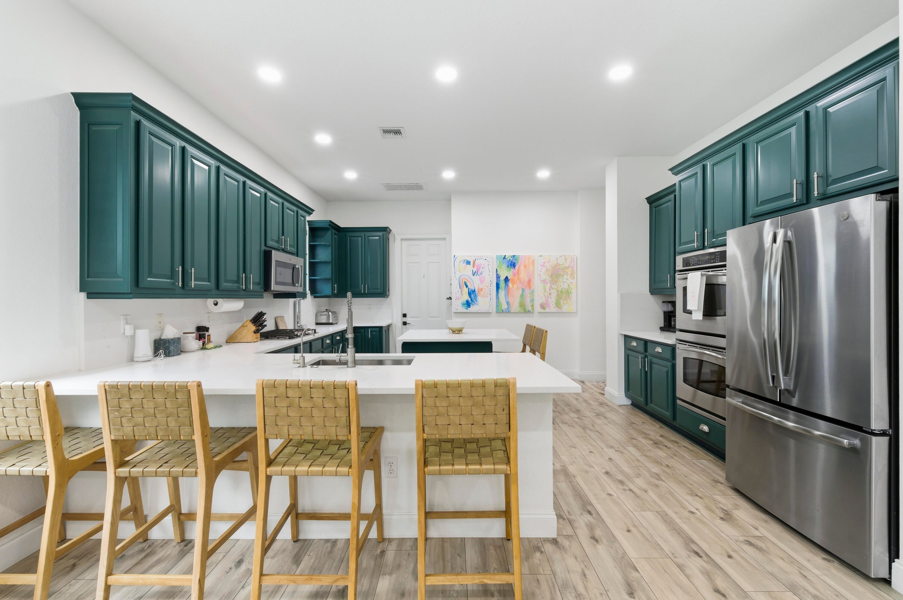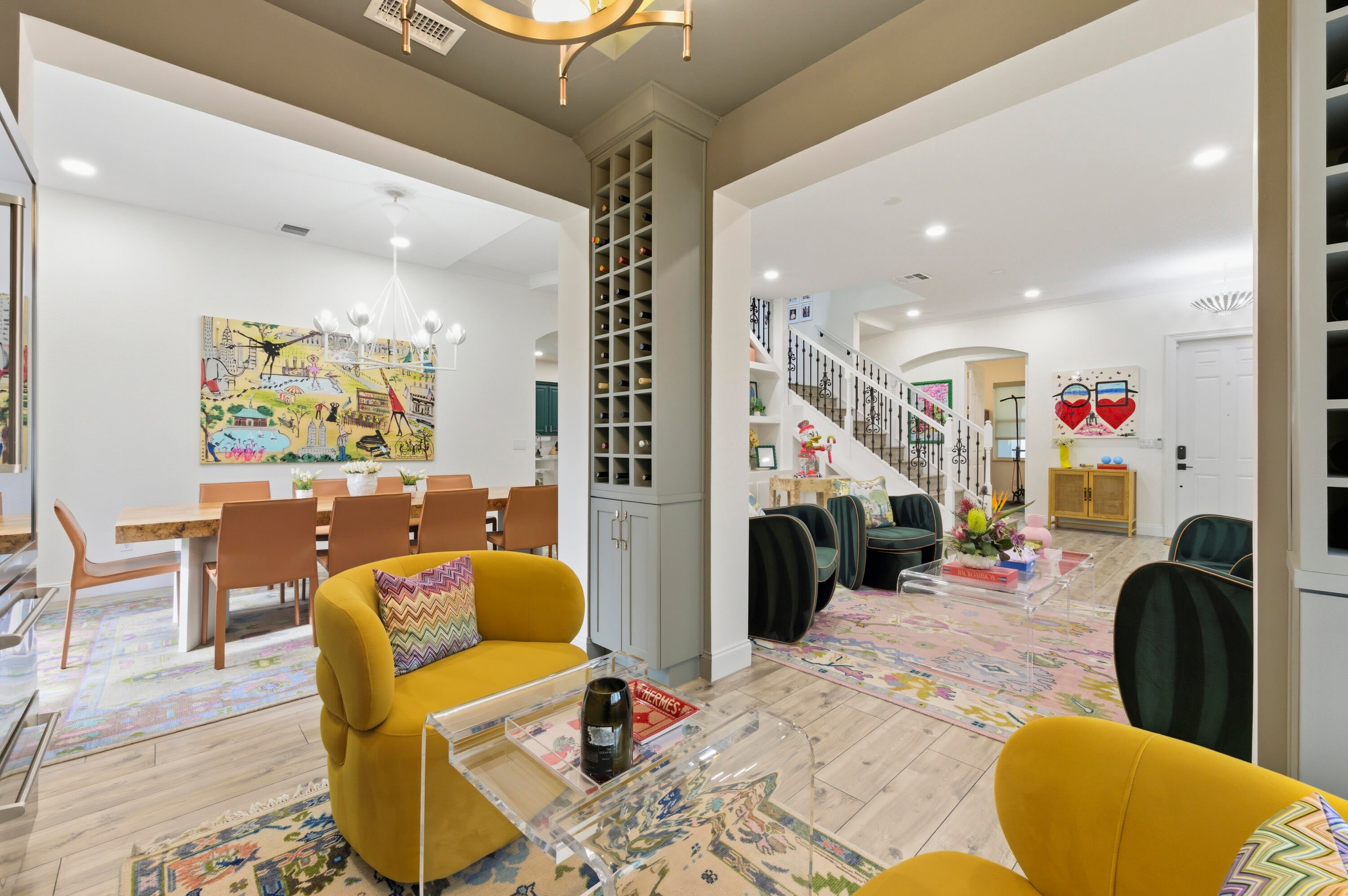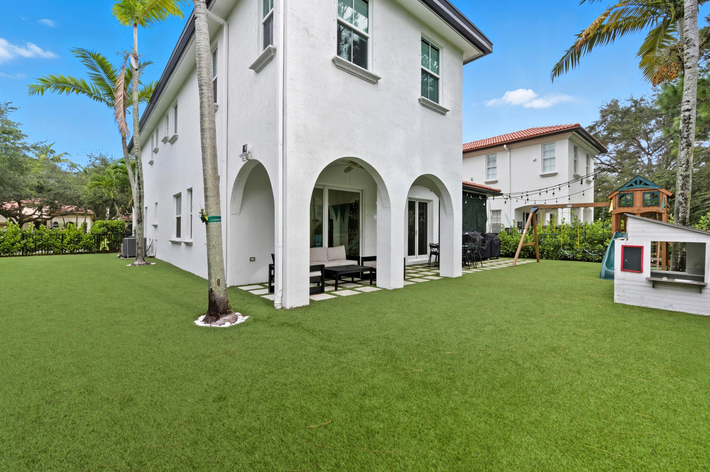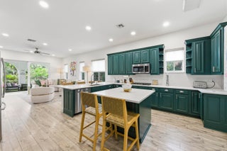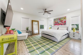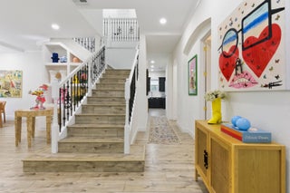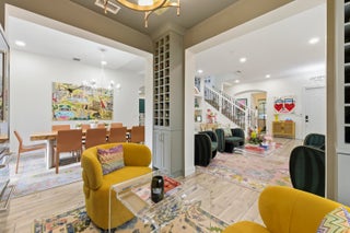 Welcome to this stunning two-story Mediterranean residence that perfectly blends warmth, elegance, and joy. From the moment you enter, you're greeted by light-filled spaces designed to make you feel happy and right at home. The interior is decorated with fun, vibrant touches that bring life to every room while maintaining a sense of sophistication.All new laminate flooring flows throughout the homes first and second floor, accented by recessed lighting, crown molding, and impact windows with custom motorized shades. Additional wellness enhancements include whole house water filtration, reverse osmosis drinking system, and Reme Halo air purifiers.The formal sitting area is a cozy conversation space that leads to a stylish custom "Martini Room" with built-ins, bar, seating, wine storage and cooler, perfect for entertaining, highlighted with a chandelier and rope lighting to create ambiance. The dining room opens to the backyard through double doors. The updated kitchen offers painted cabinetry, new quartz countertops, stainless steel GE appliances including double wall ovens, and a sleek stainless sink with disposal. A walk-in pantry under the staircase adds charm and storage. The first floor also features a guest bedroom and full bath with quartz vanity, custom Missoni wallpaper, and frameless shower. Upstairs, a versatile loft connects to four bedrooms. The spacious primary suite includes a private foyer, dual custom closets, and an updated bath with soaking tub, shower, painted cabinetry, and quartz counters. Additional bedrooms feature recessed lighting and built-in closets, one even offers its own private balcony. The laundry room, equipped with Electrolux washer/dryer and storage, adds convenience. Step through impact sliders to a cheerful backyard oasis featuring a covered lanai with fan and mounted lighting, all surrounded by lush Clusia hedges and turf for easy maintenance. Thoughtfully painted inside and out, this home radiates personality, comfort, and happinessevery detail curated to make you smile.