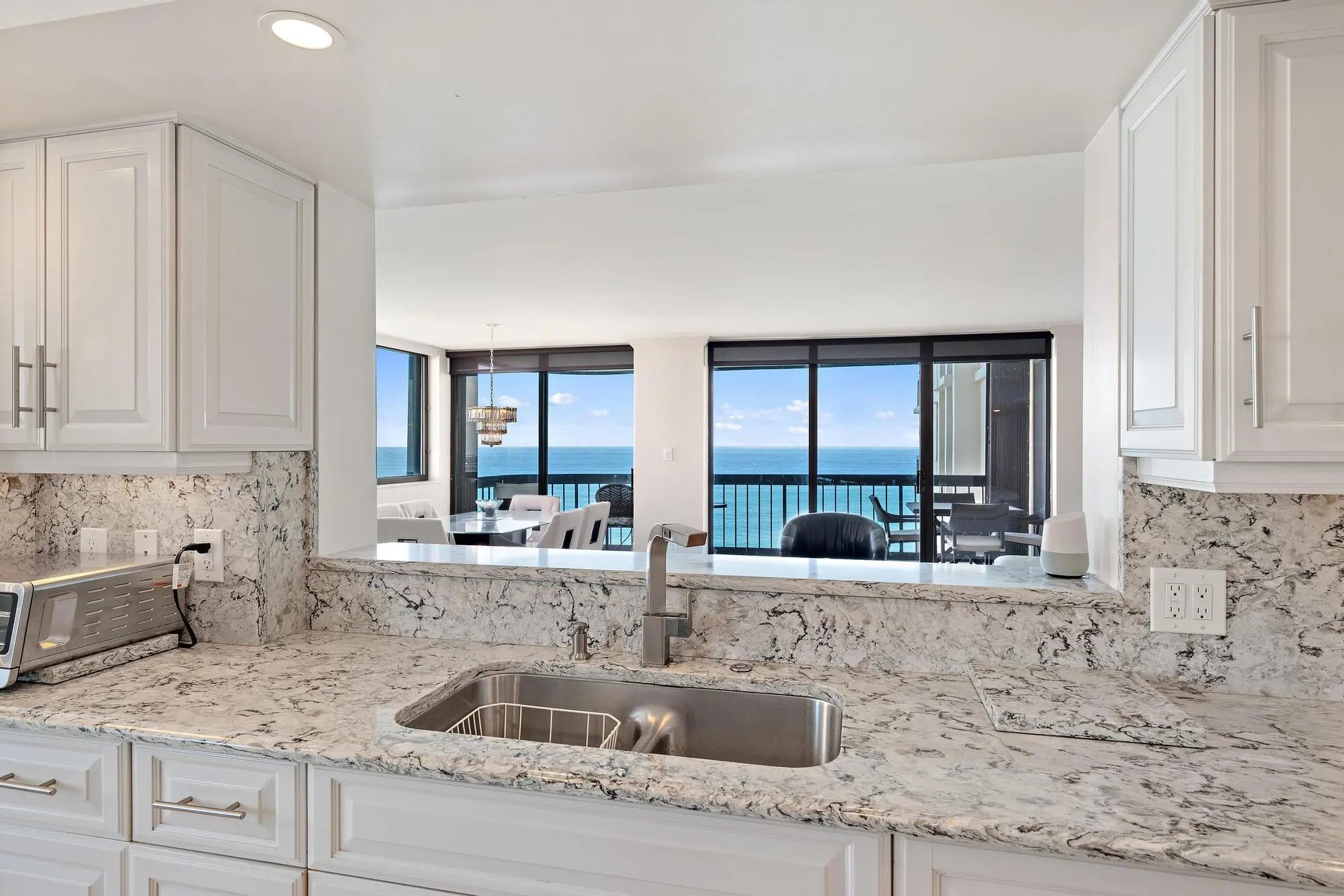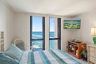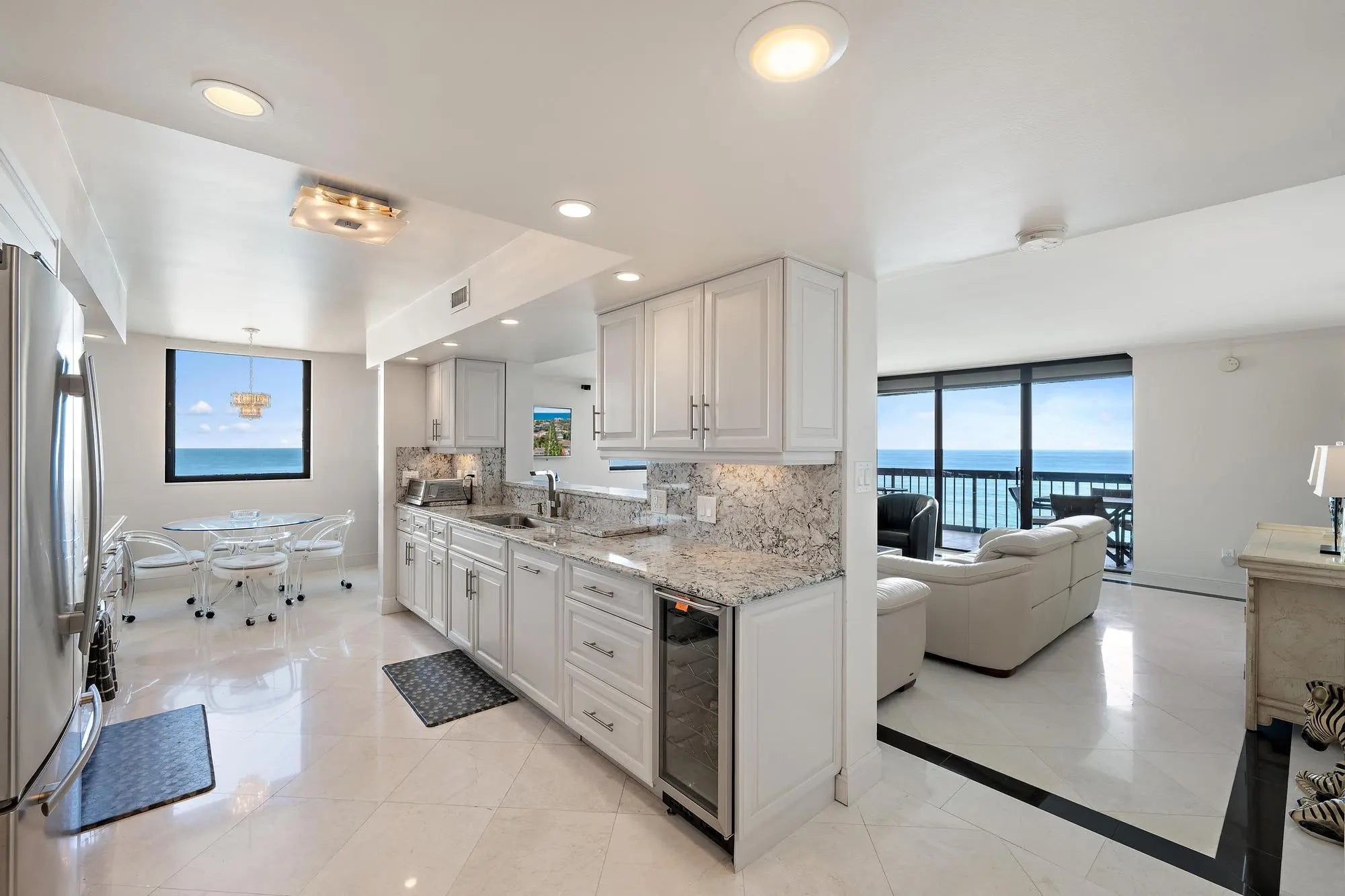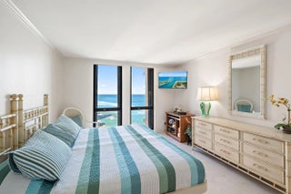 Wake each morning to sweeping Atlantic views from this beautifully appointed two-bedroom, two-bath residence designed for effortless coastal living. Floor-to-ceiling glass invites natural light into every room, while an expansive east-facing balcony captures the sunrise and the soothing rhythm of the ocean.Elegant marble flooring flows throughout the interior, complementing a refined kitchen outfitted with premium appliances, a wine cooler, and generous workspace for both casual dining and entertaining. The open layout enhances the sense of space and connection to the sea beyond.